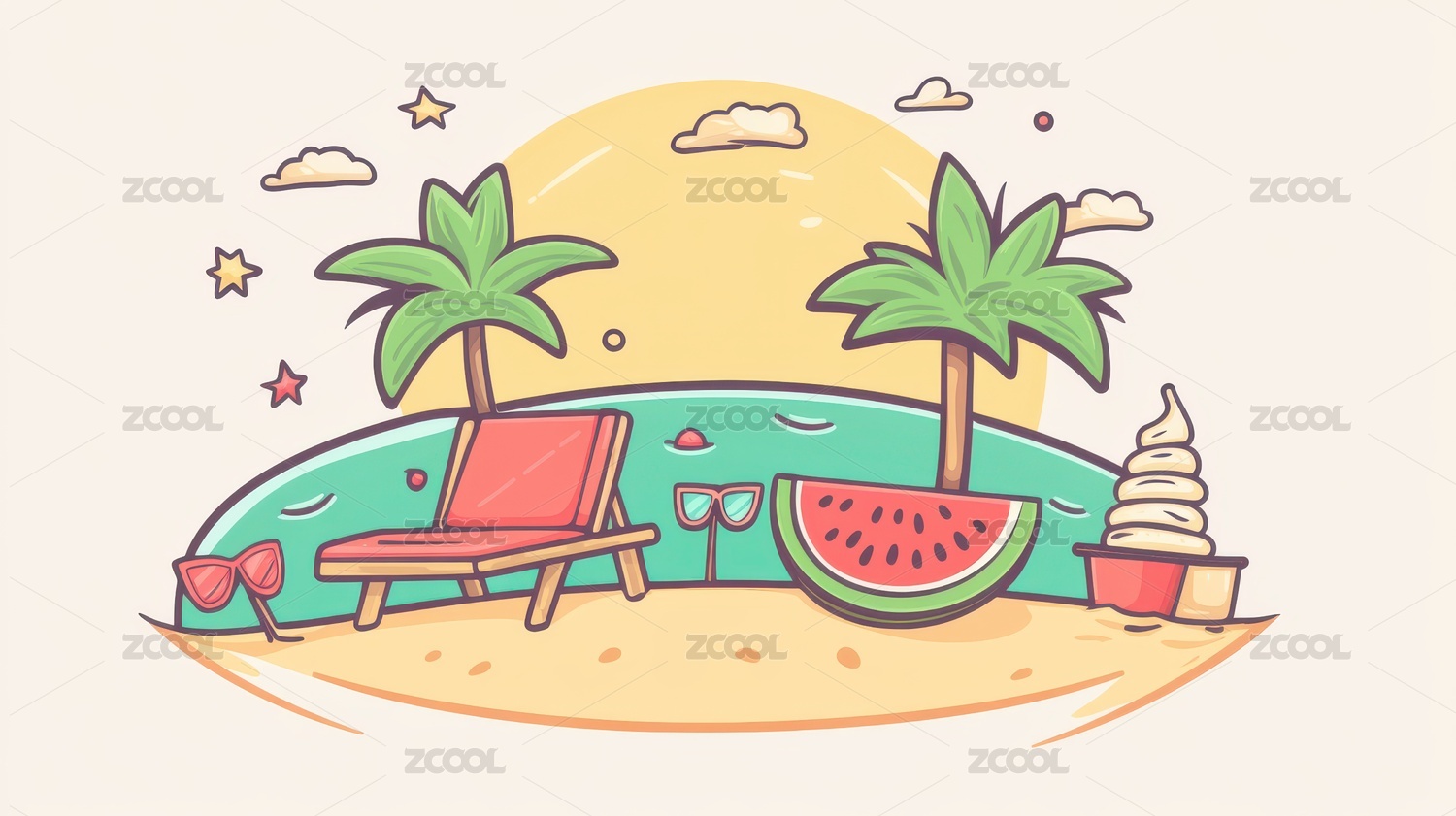 阴影,云朵,西瓜,躺椅,海滩,椰树,冷饮,太阳