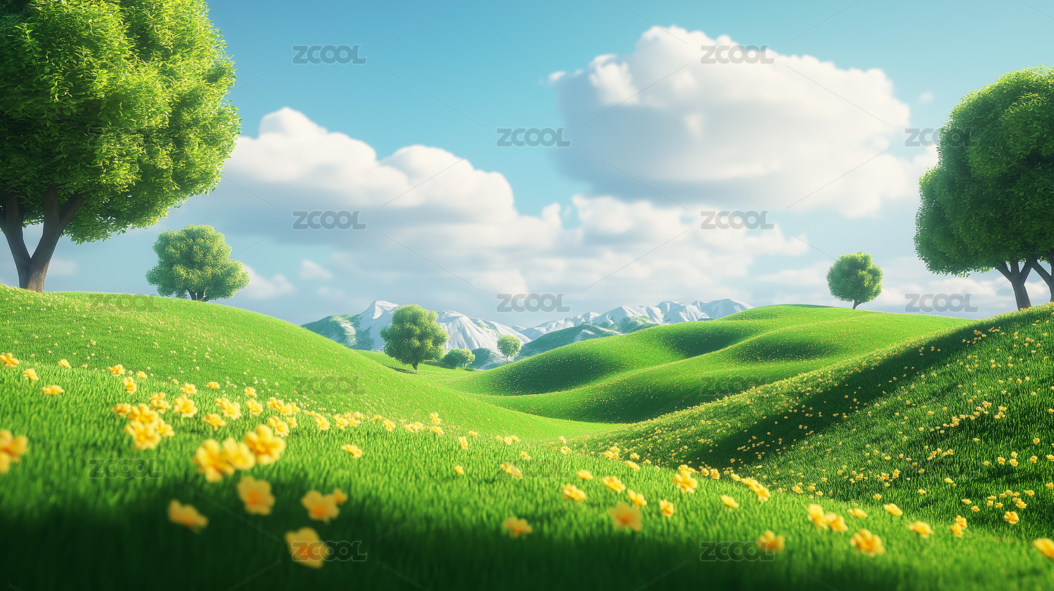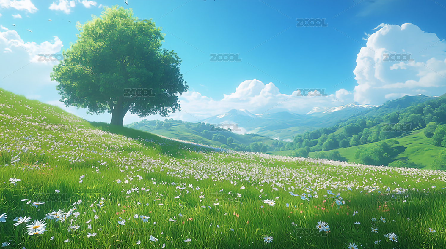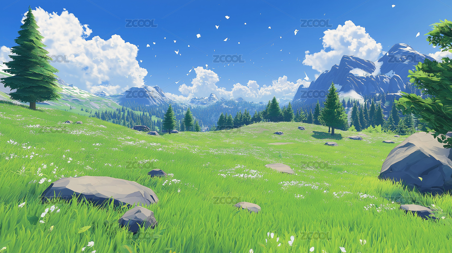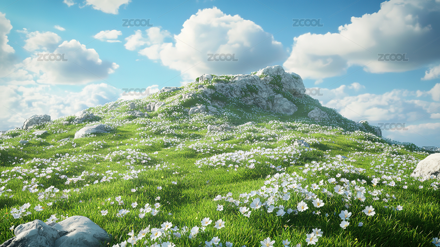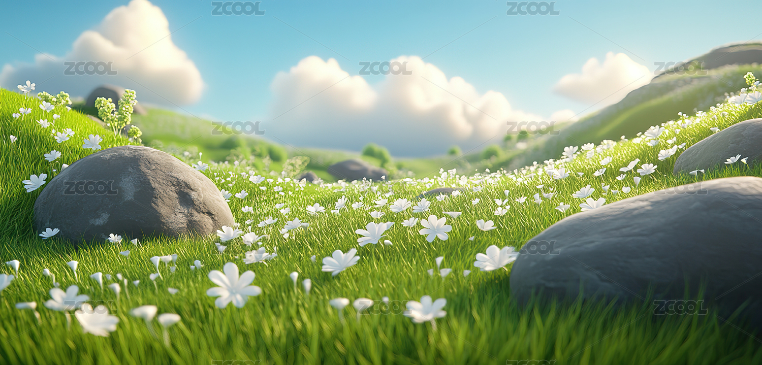 岩石,自然,宁静,蓝天,白云,阳光,草地,小树,广阔,田园