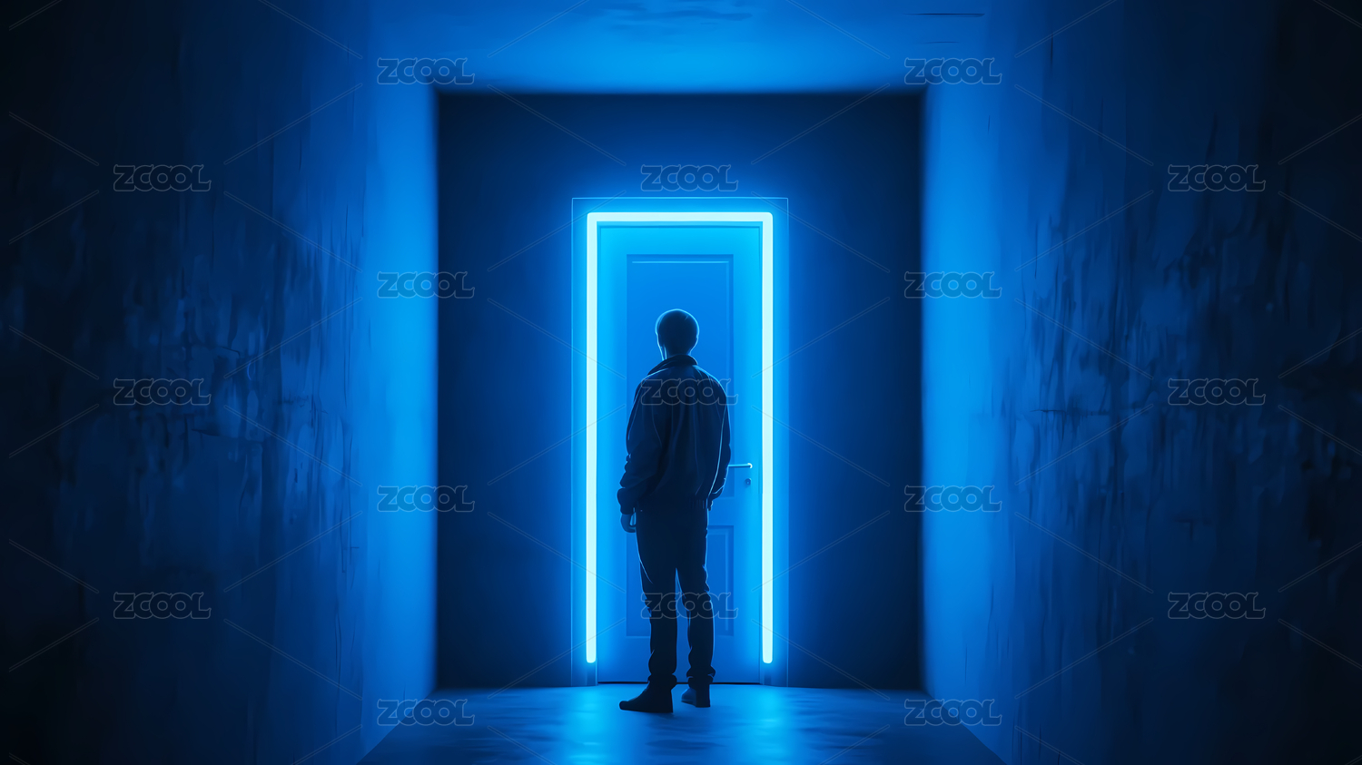 人物在蓝色光廊中背影