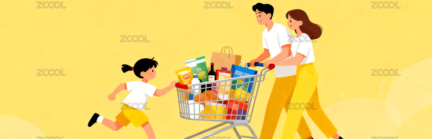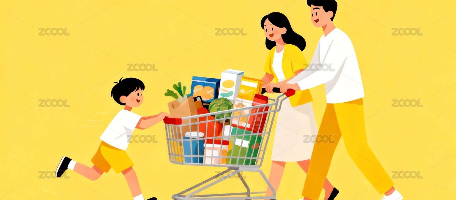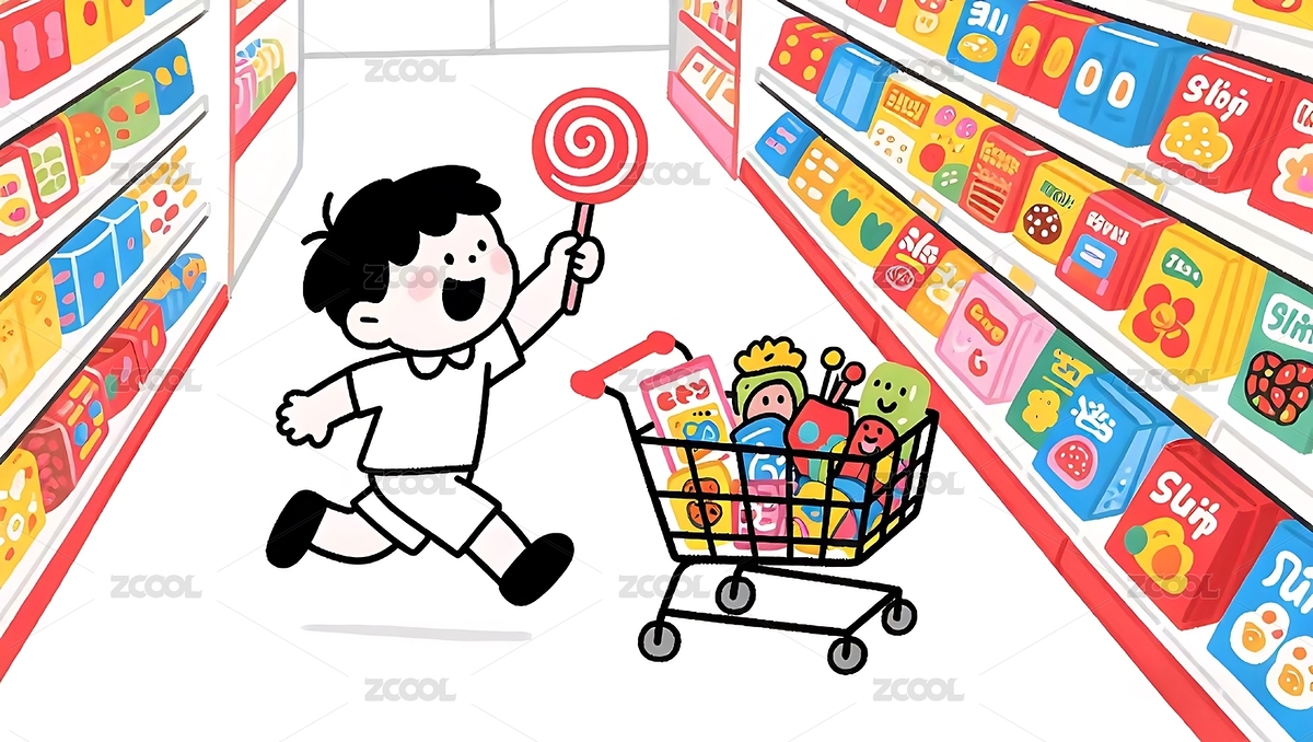 购物,超市,孩童,推车,糖果,货架,零食,开心,奔跑,童趣