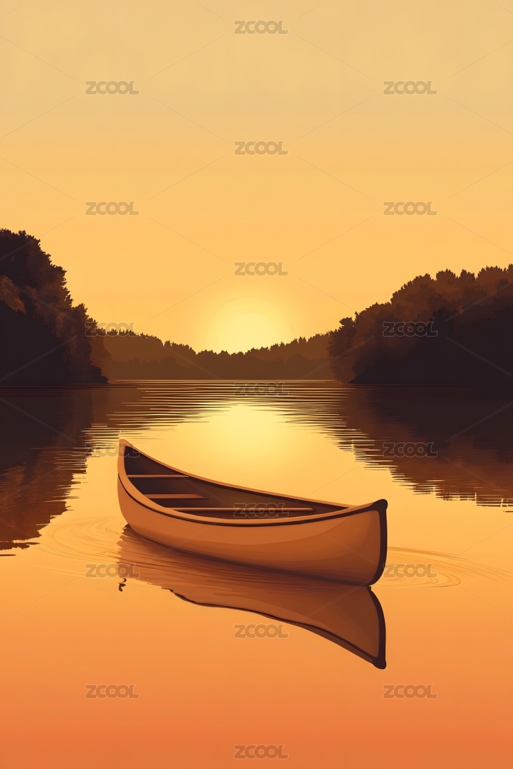 金色河面上的独木舟与晚霞