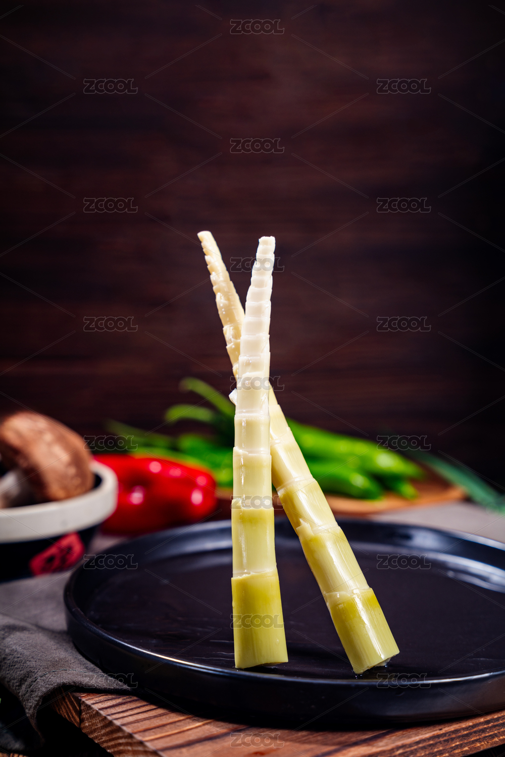 黑盘,新鲜竹笋,食材,美食,质感,静态展示,深色背景,翠绿薄荷叶,辣椒点缀,木桌