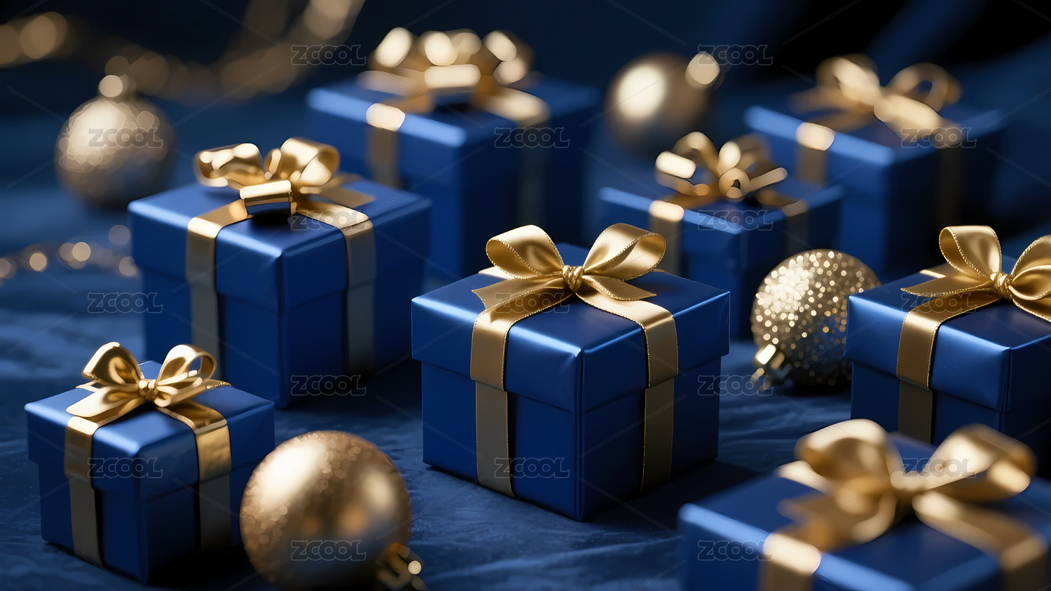 蓝色,背景,金色,深蓝,蝴蝶结,礼盒,布料,珠链,装饰球,前景