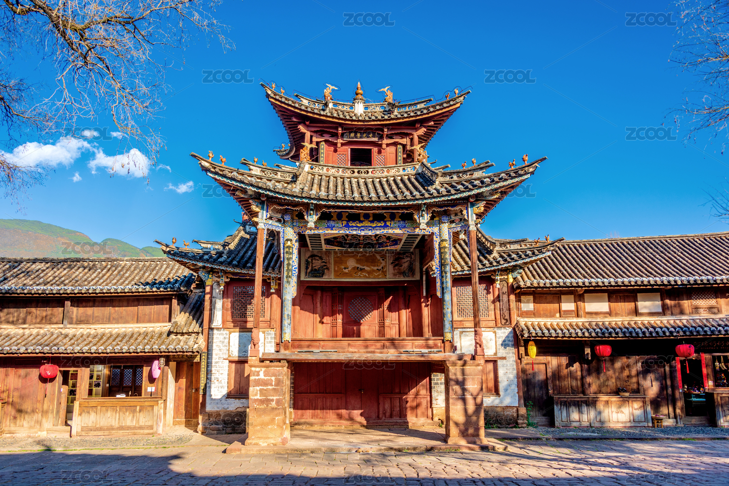 大理沙溪古镇古戏台古树石头地面