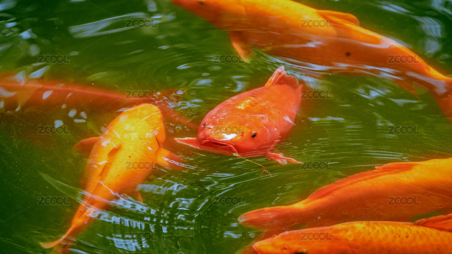 池塘中颜色艳丽追逐嬉戏的锦鲤