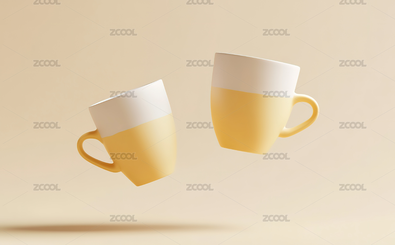 两个色彩缤纷咖啡杯并排放在桌子上图片