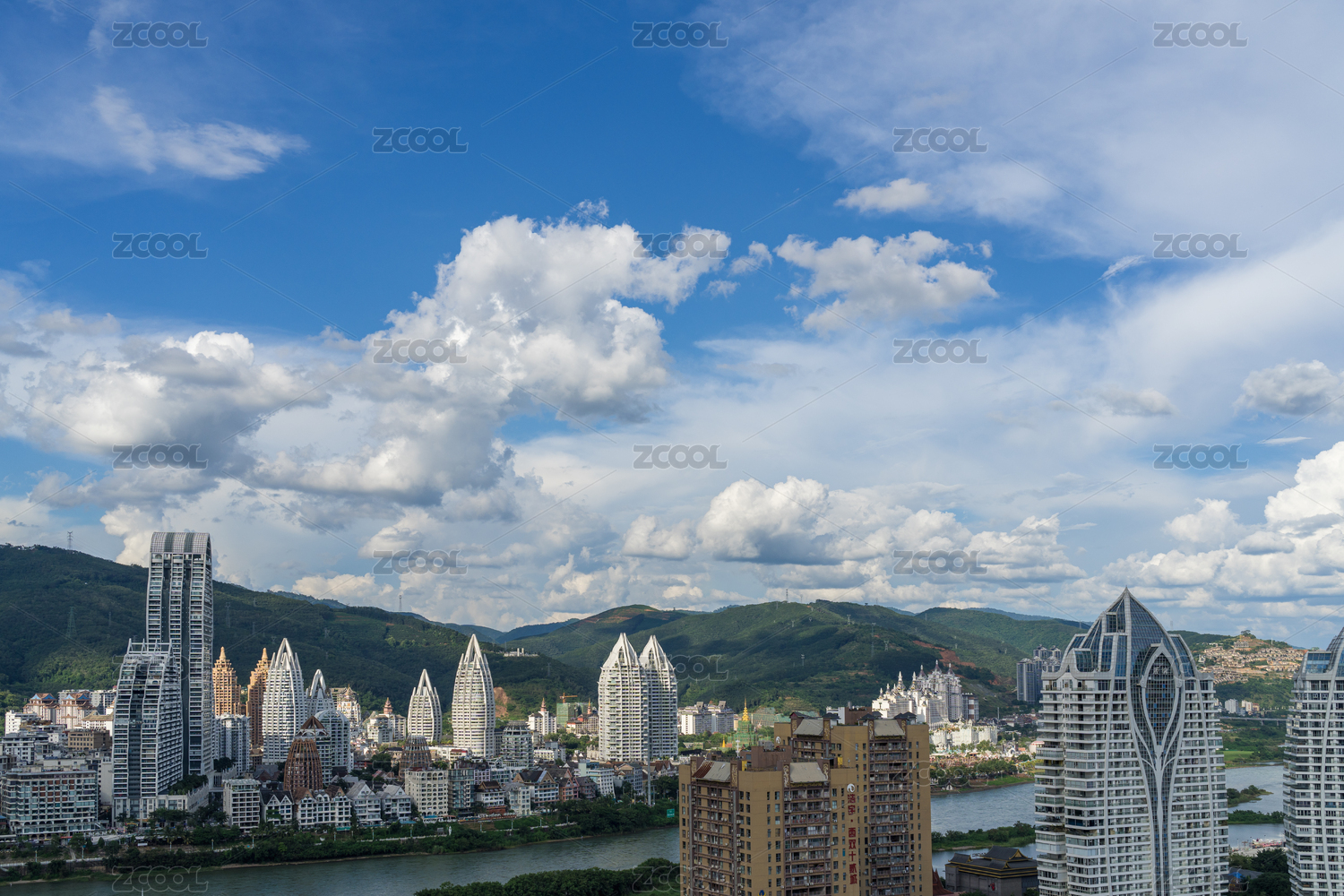 城市,建筑,高楼,天际线,山脉,河流,自然景观,都市风貌,现代建筑,山水