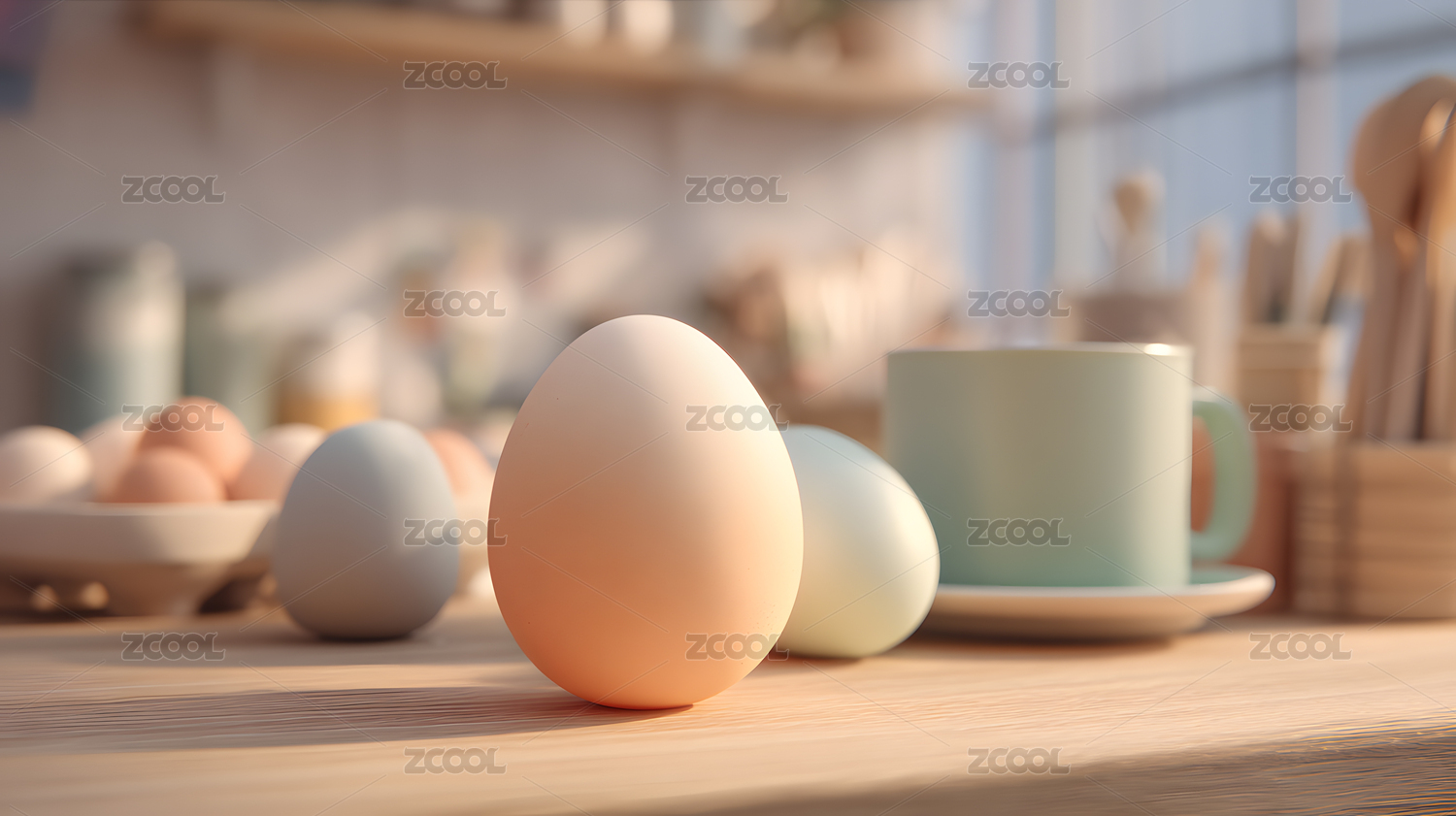 白色背景下桌子上的鸡蛋和容器的特写镜头