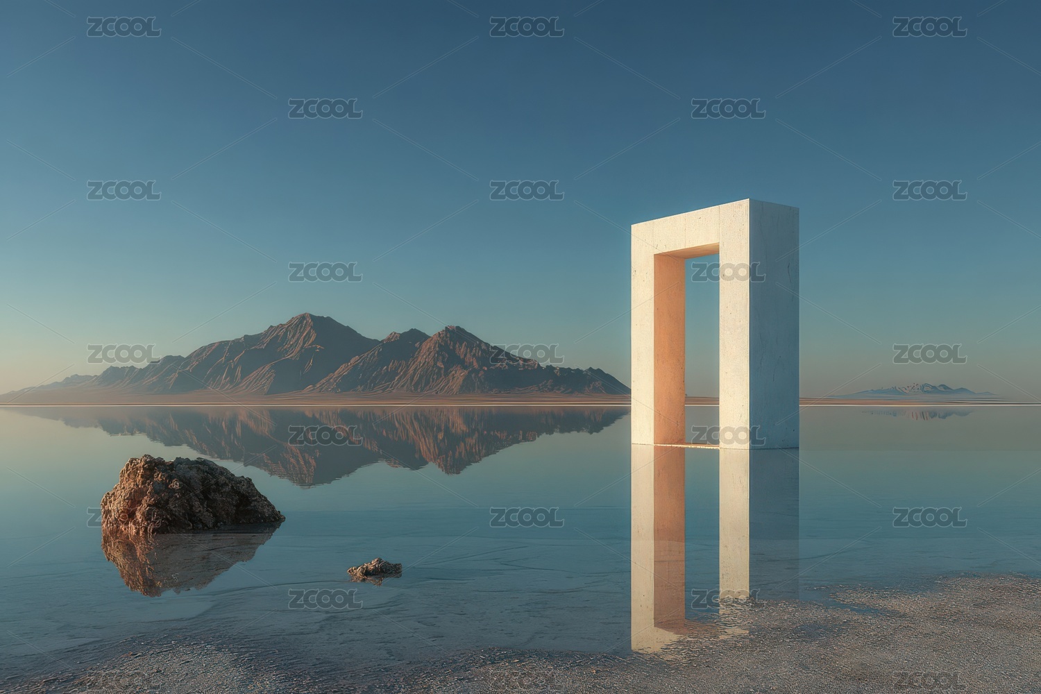 抽象艺术门框与镜面湖水倒影