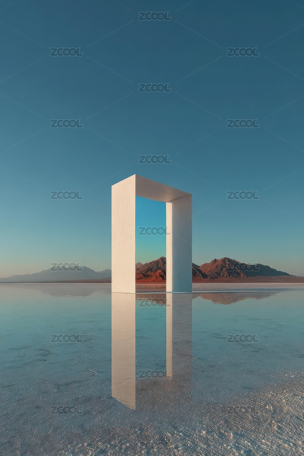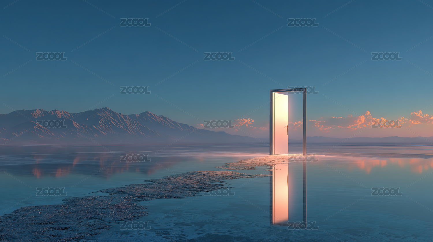 水面,倒影,湖面,山峰,玻璃门,夕阳,清晨,梦幻