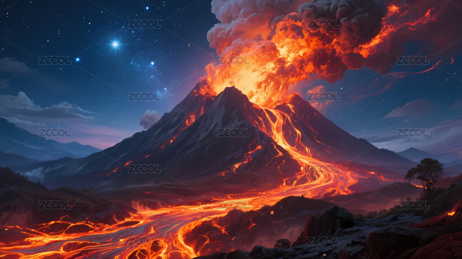 橙色,红色,岩浆,拱门,深蓝色,夜空,星星,山峰,熔岩,神秘