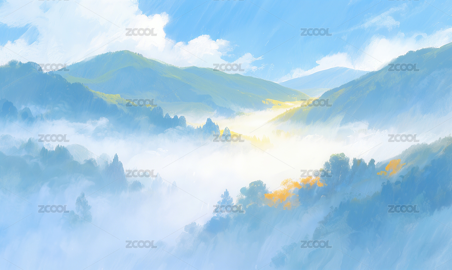 蓝天山景云雾缭绕插画图