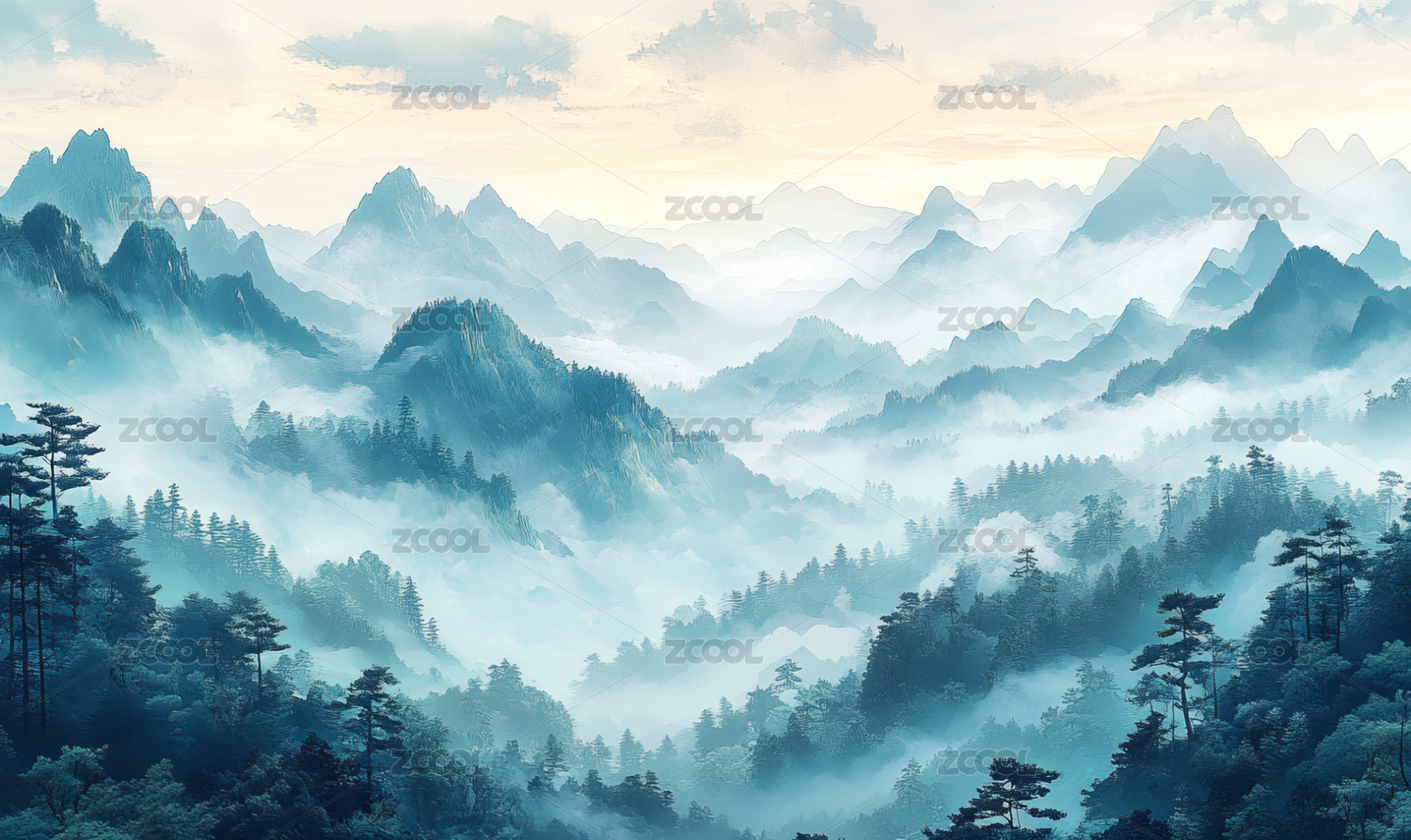 中国风山间云雾唯美水墨风景插画