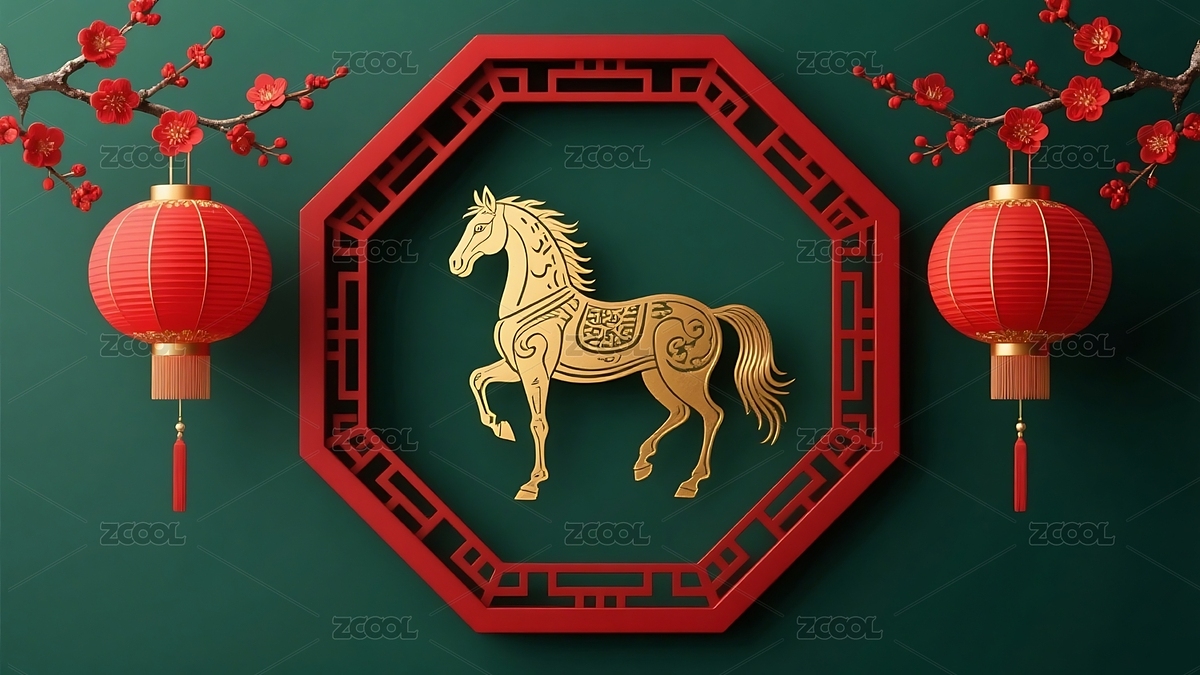 八角框,金骏马,红边框,绿背景,红灯笼,梅花枝,中式风,金属感,古典美,装饰性
