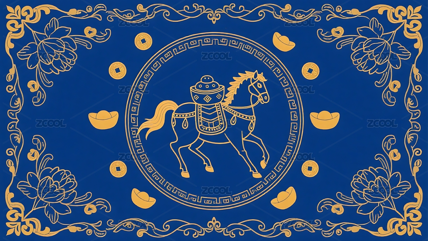 蓝底,金云,骏马,祥瑞,鎏金,静态,飘逸,鬃毛,长尾,矫健