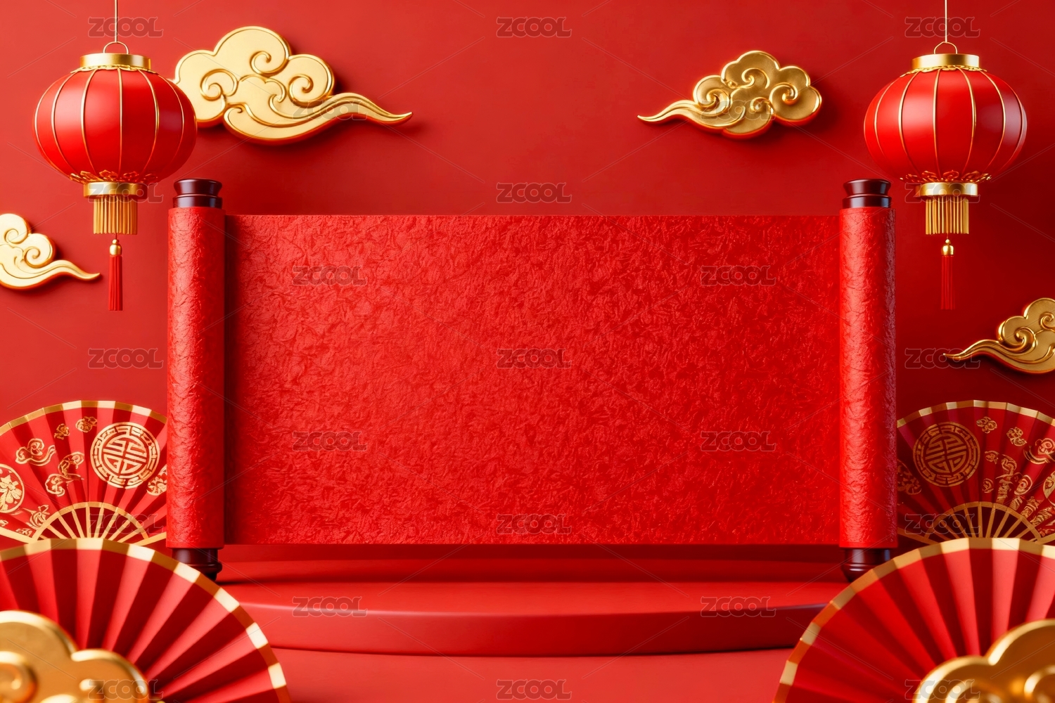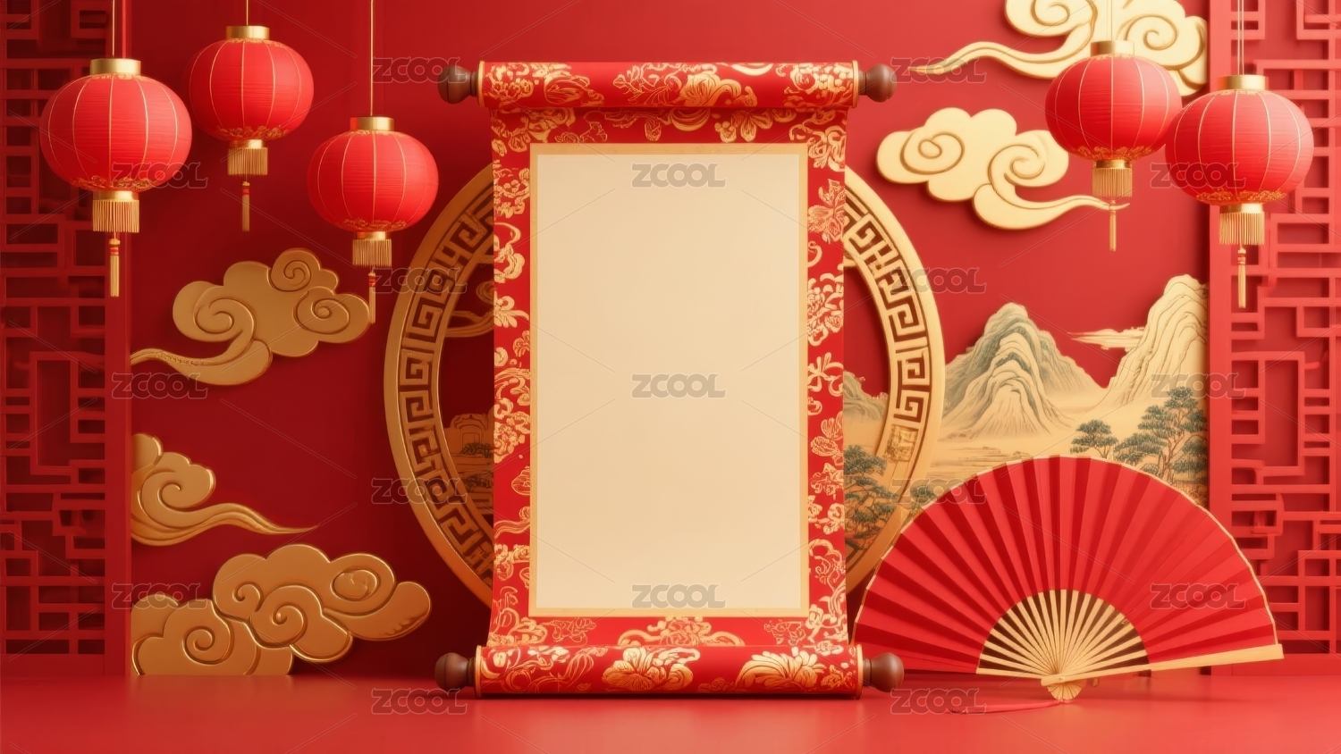 红底,金框,卷轴,灯笼,折扇,祥云,中式,传统,喜庆,典雅