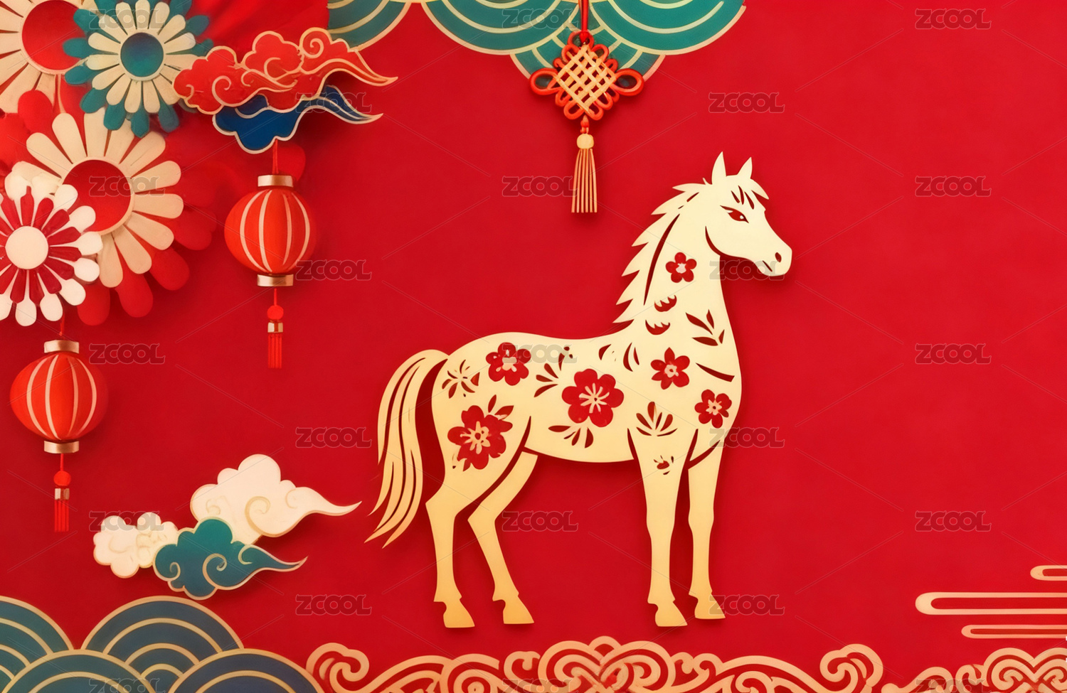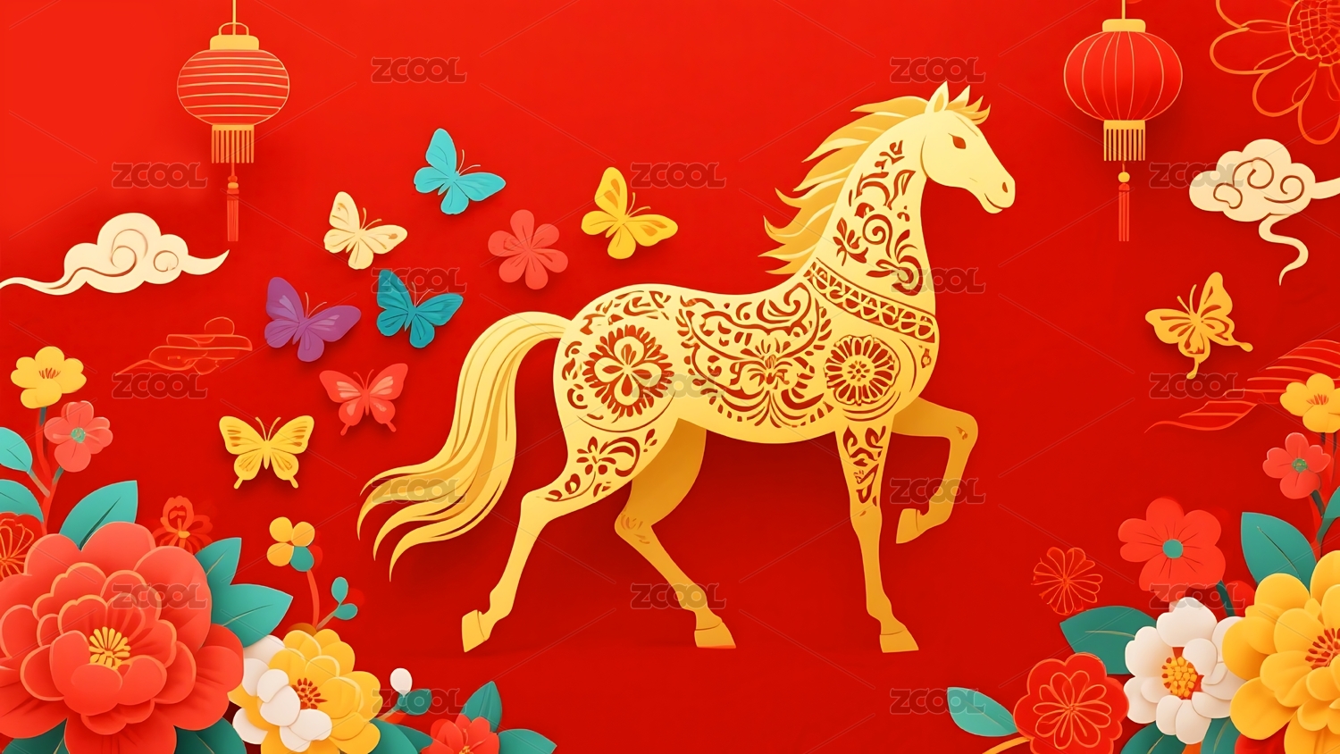 红底,金驹,剪纸,花纹,鬃尾,灯笼,花卉,祥云,新春,氛围