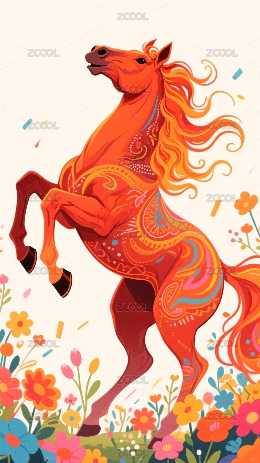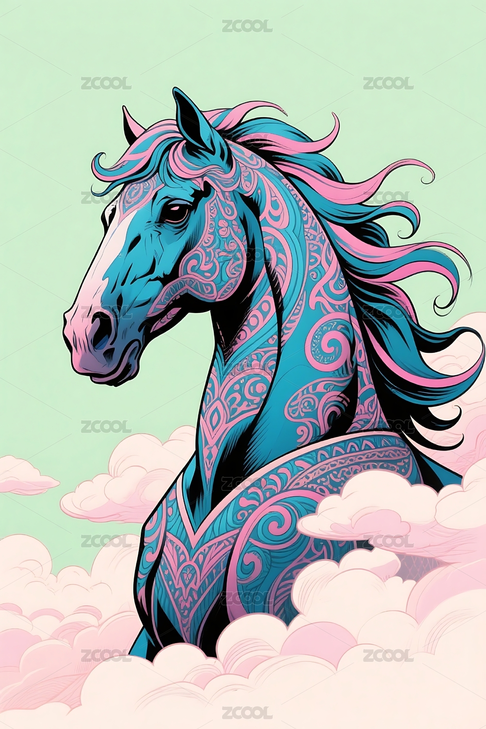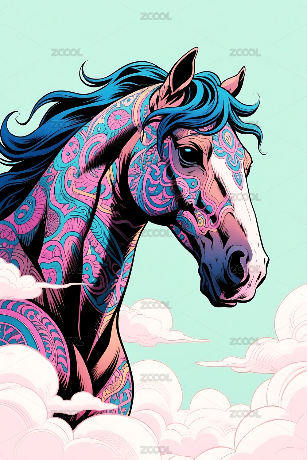 骏马,炫彩,花纹,蓝色,粉色,紫色,毛发,飘逸,图案,复杂