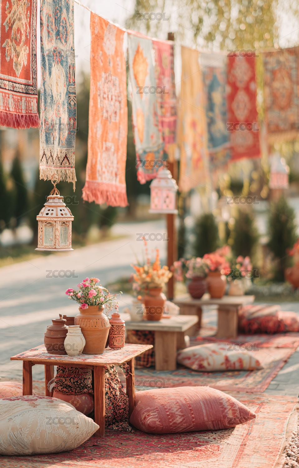 异域风情客厅色彩斑斓的地毯和靠垫圆形茶几上的陶罐墙上悬挂的灯笼