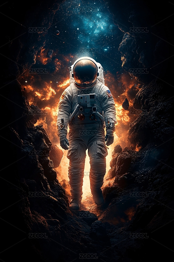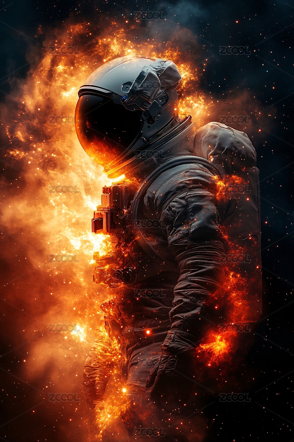 宇航员,宇宙,星空,火焰,场景,插画,科幻,神秘,深邃,太空服