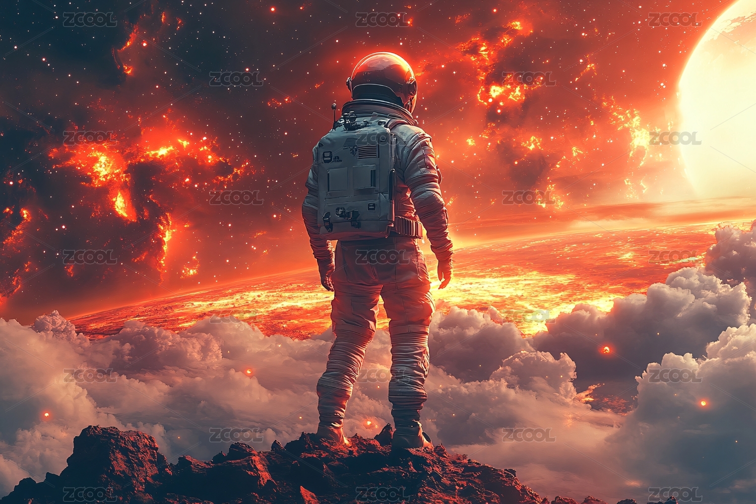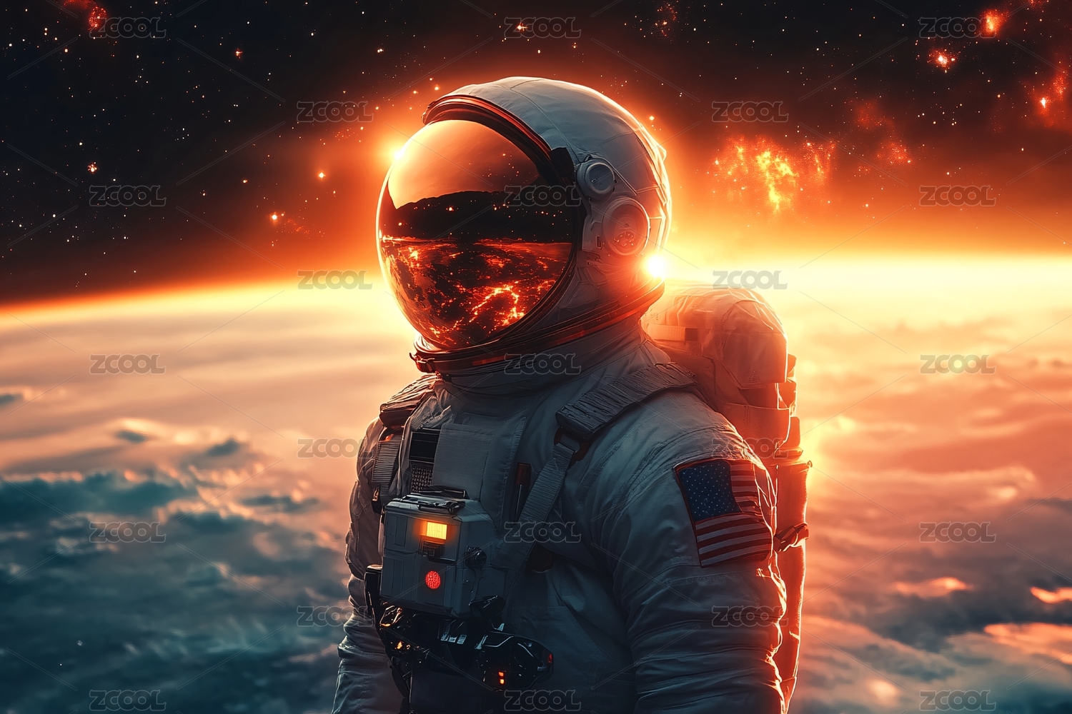 宇航员,火焰,太空,科幻,插画,画面元素,主题词,背景元素