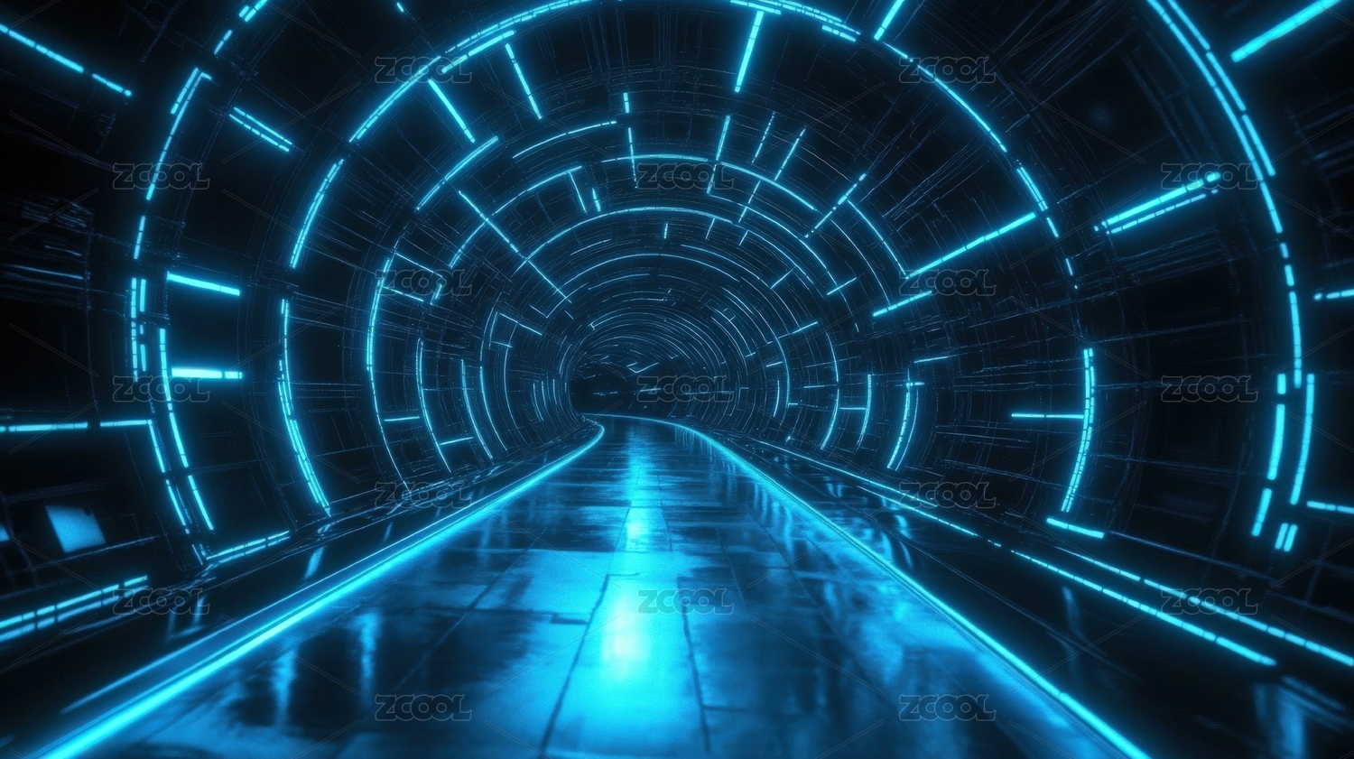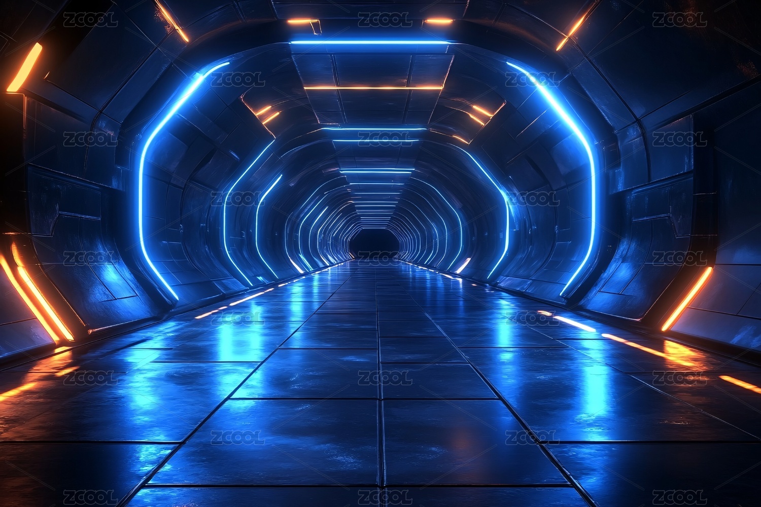 隧道,蓝光,橙光,科幻,未来感,插画,光影,空间,通道,虚拟