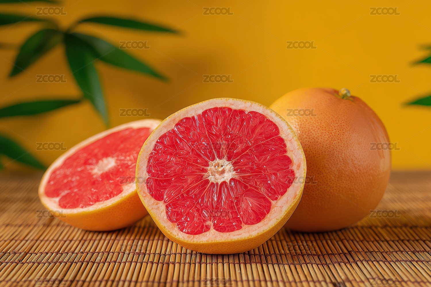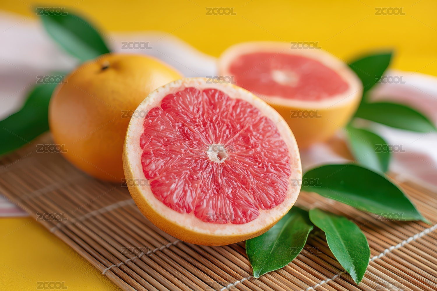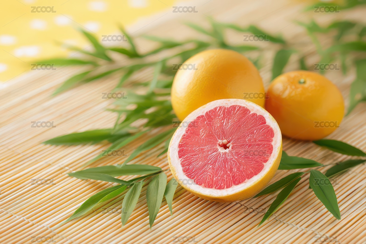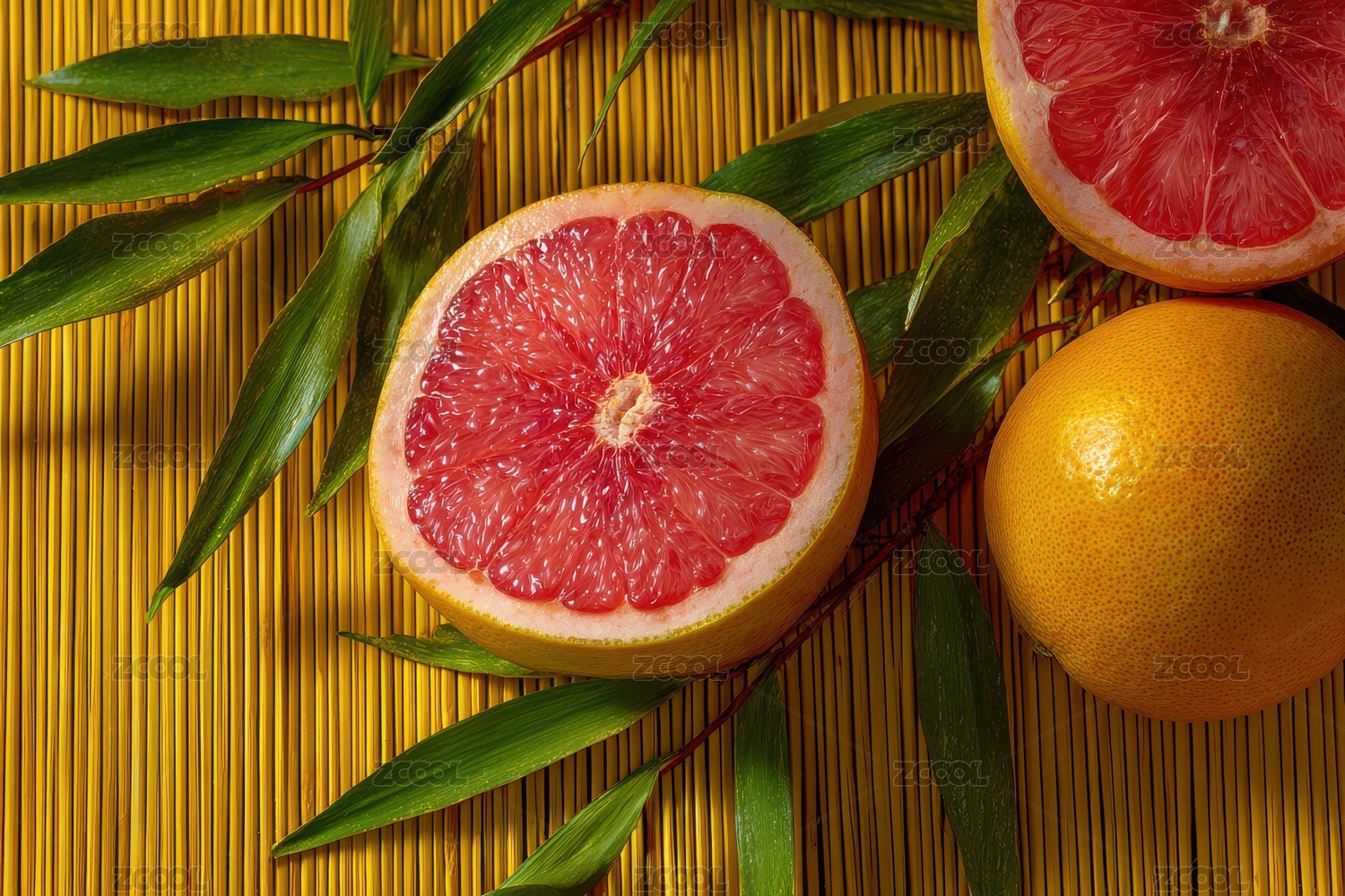 绿叶,背景,柚子,黄色,果肉,红色,切面,桌垫,竹垫