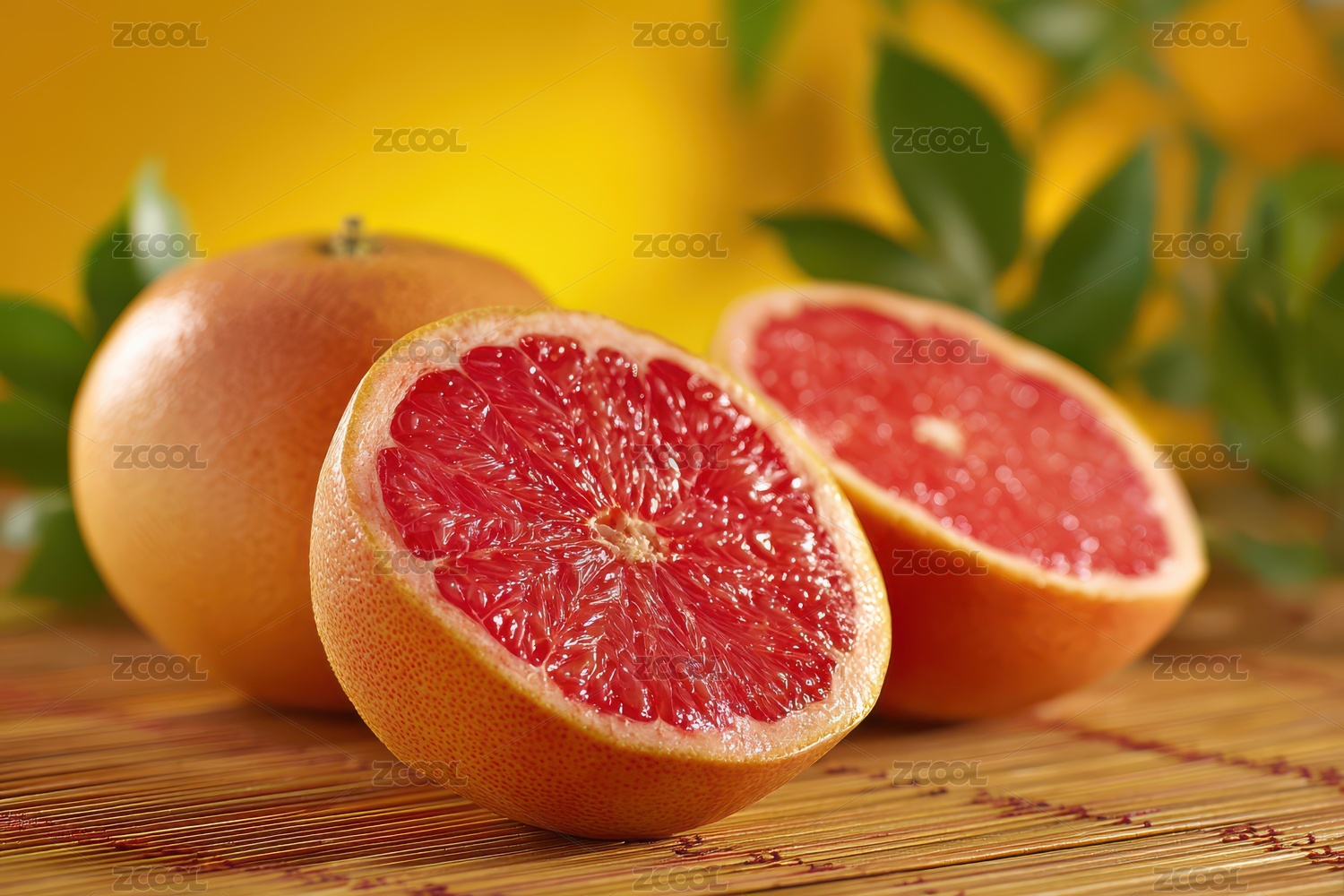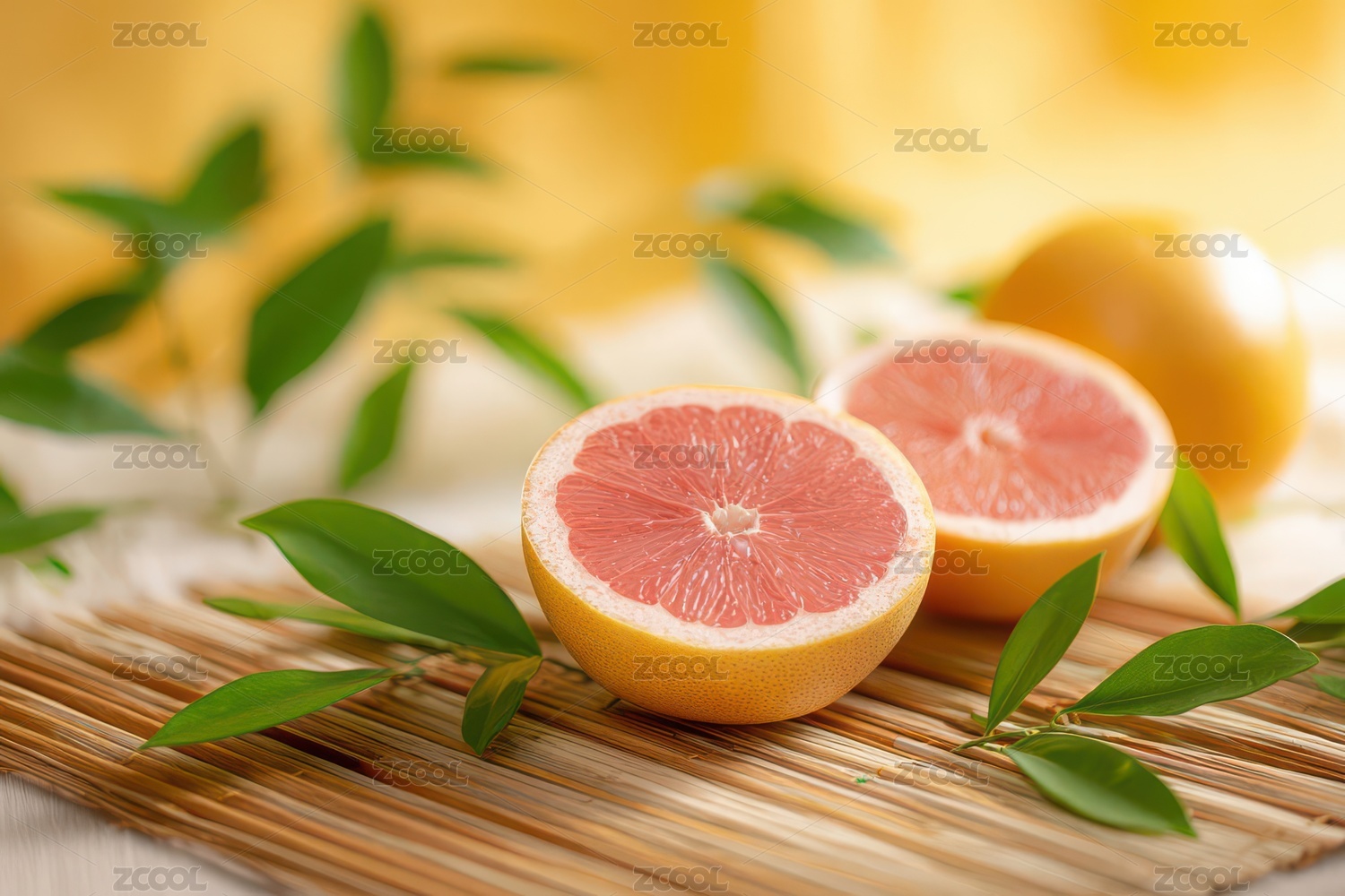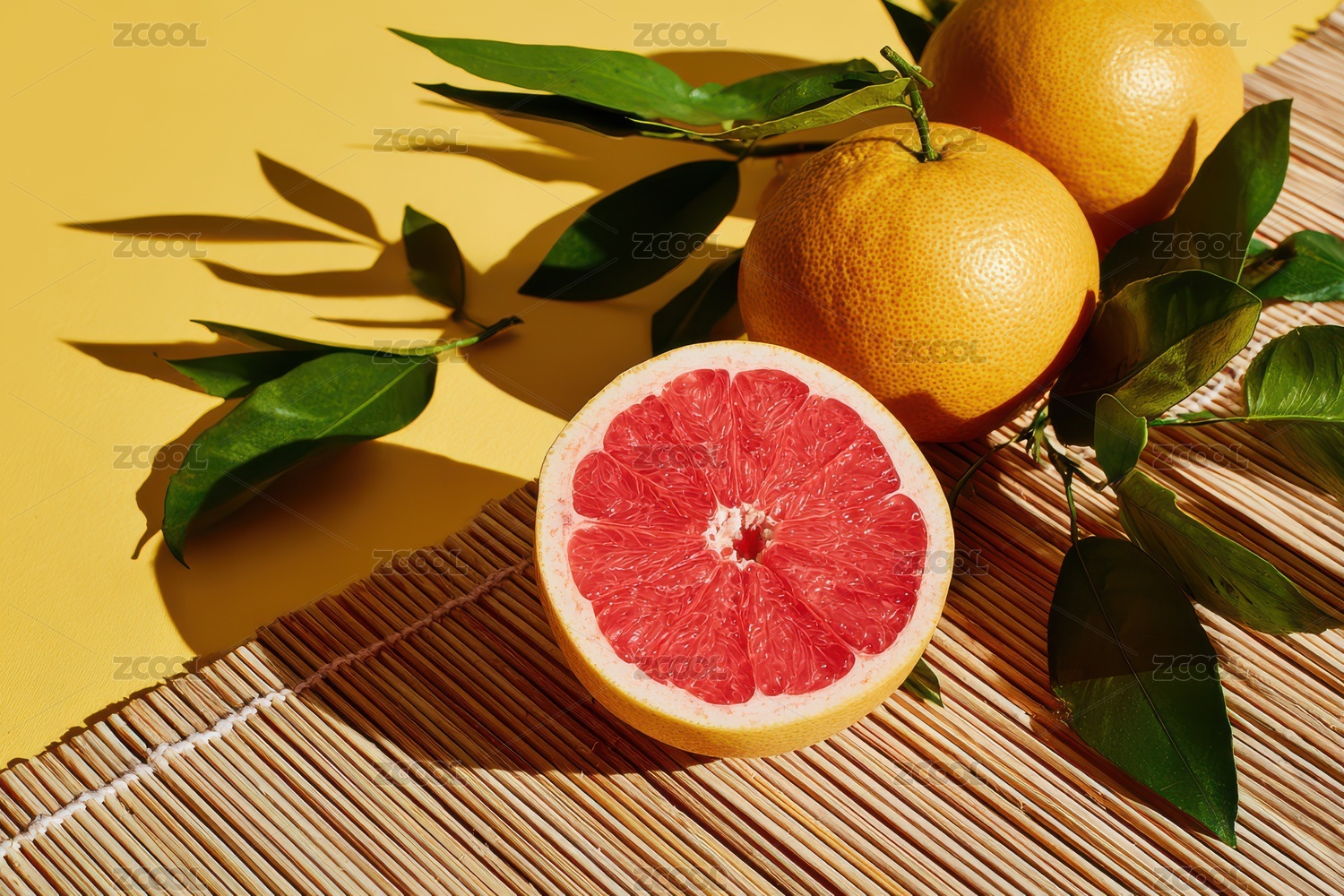 绿叶,背景,柚子,黄色,果肉,红色,切面,桌垫,竹垫