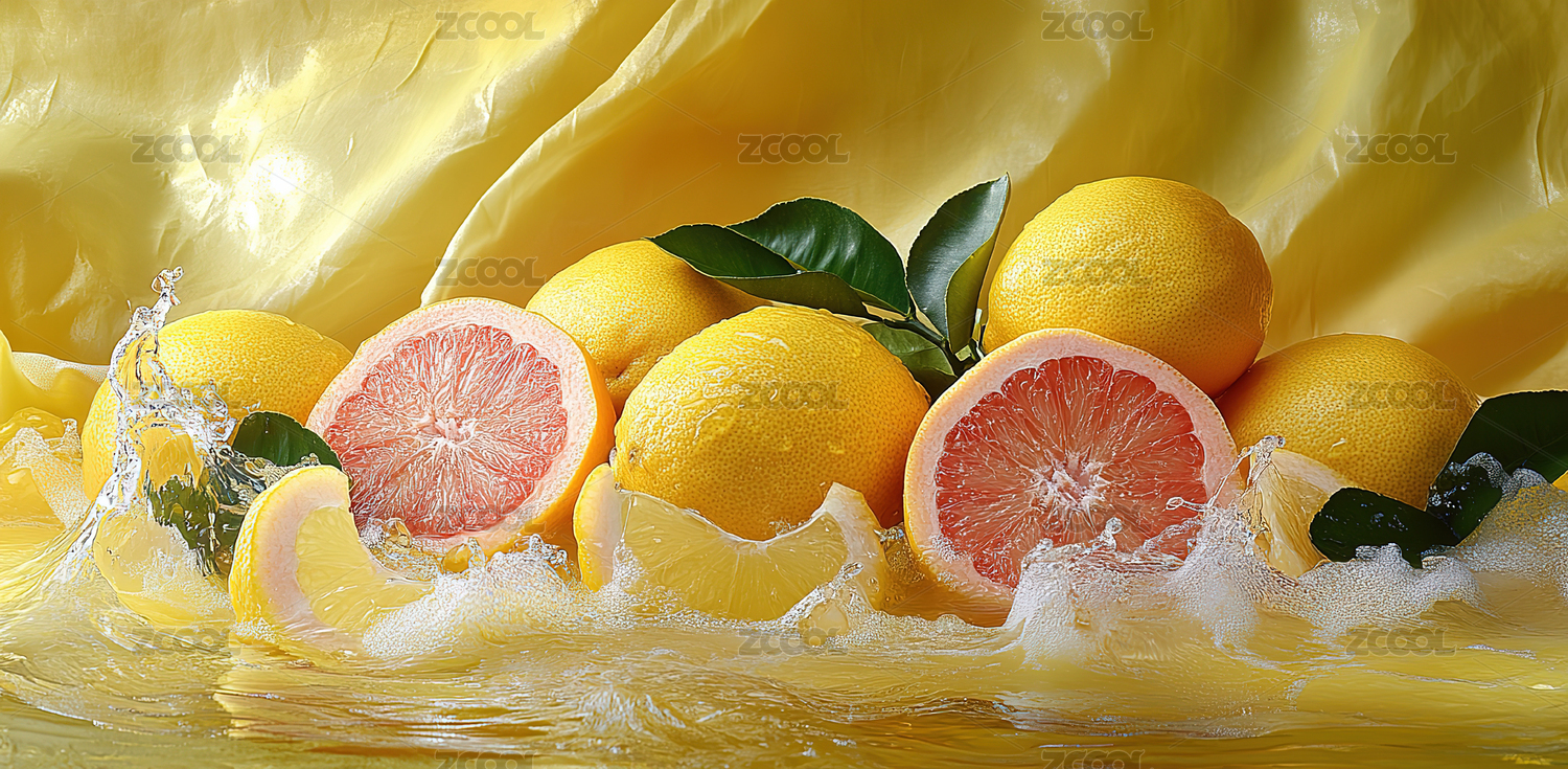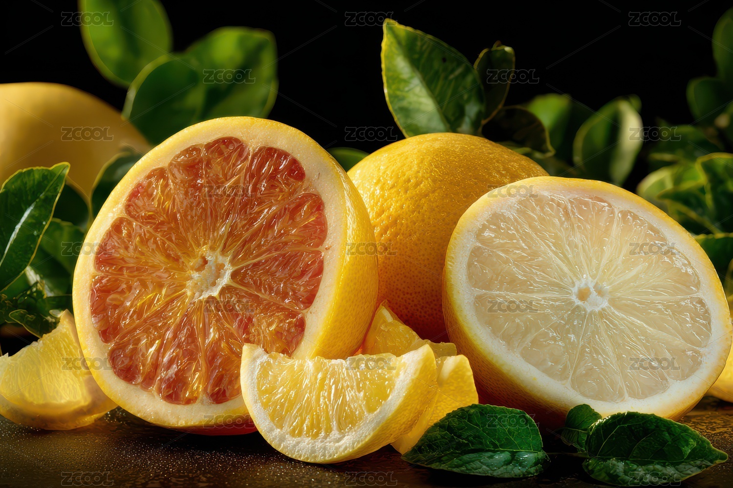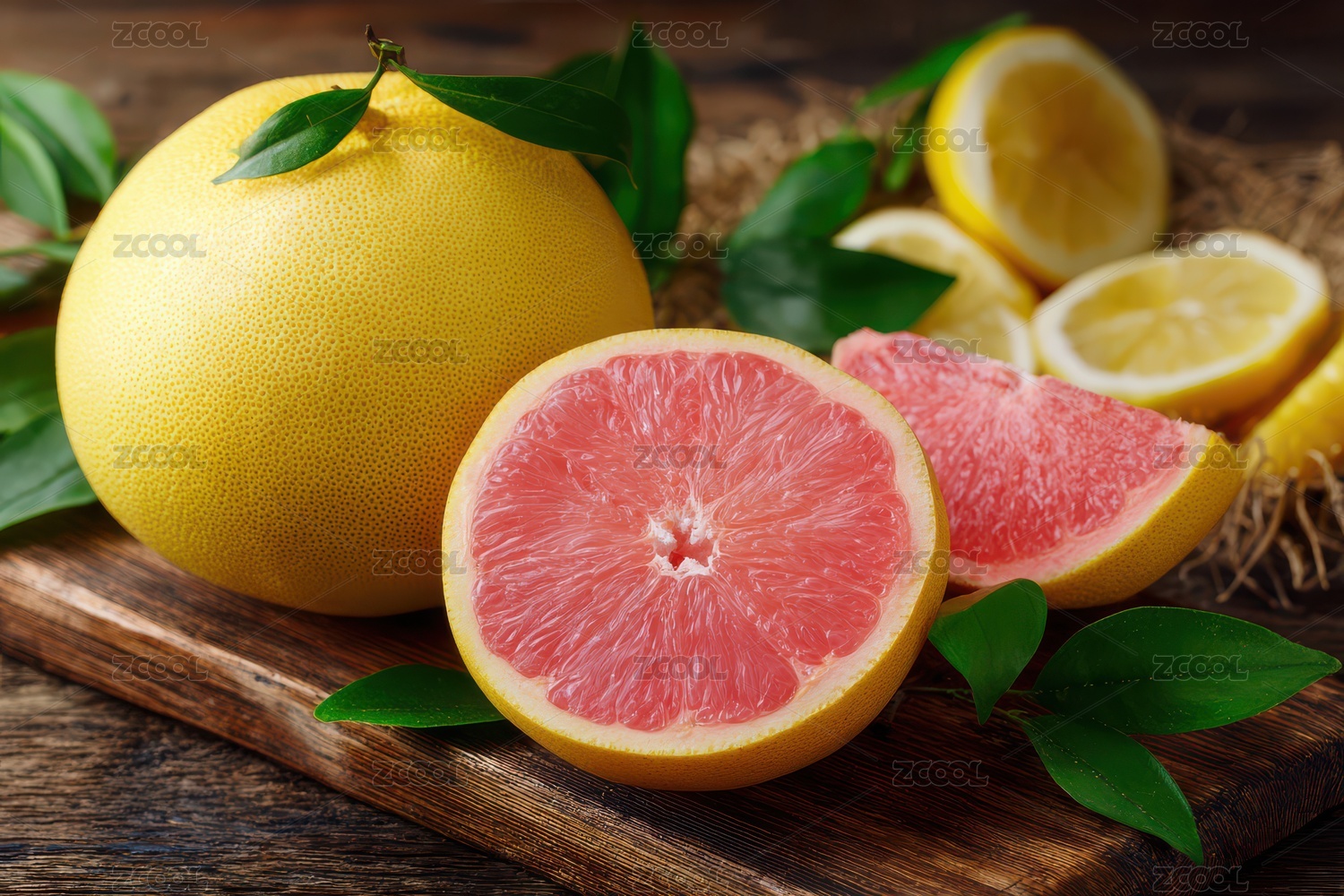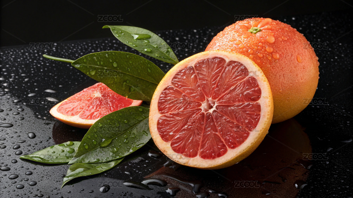 绿叶,背景,柚子,黄色,果肉,红色,切面,桌垫,竹垫