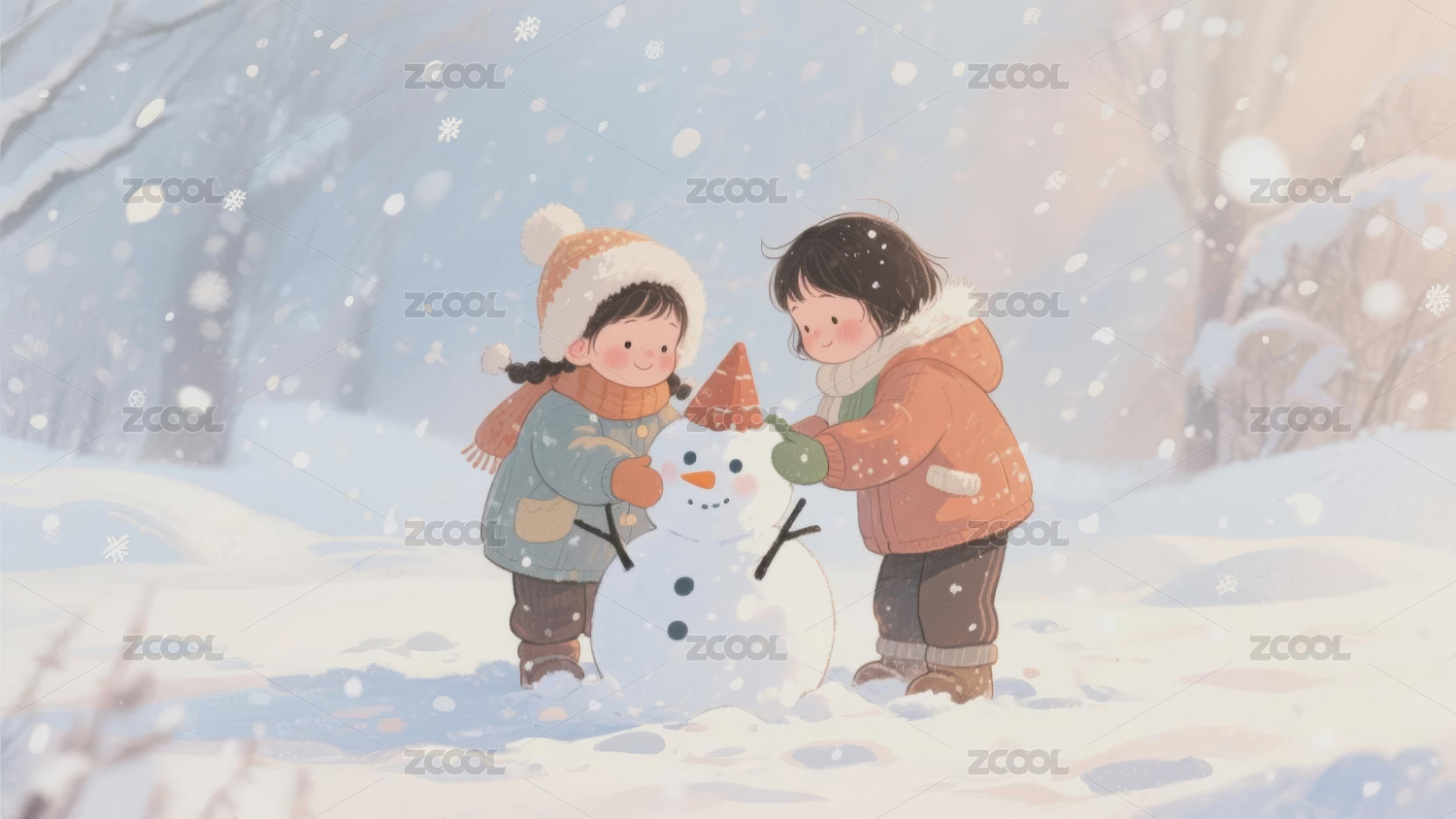 小女孩与小男孩在雪地上堆雪人
