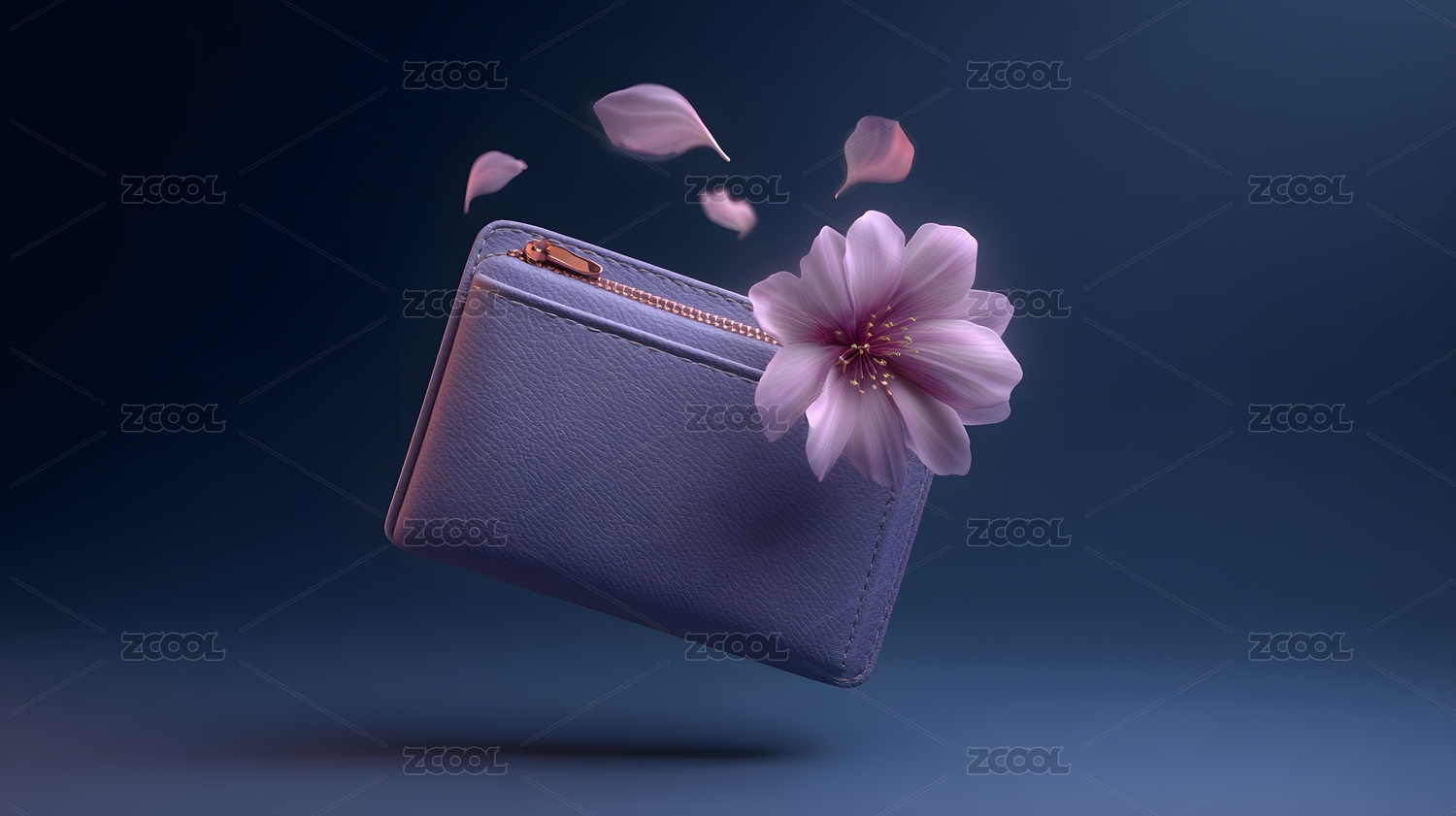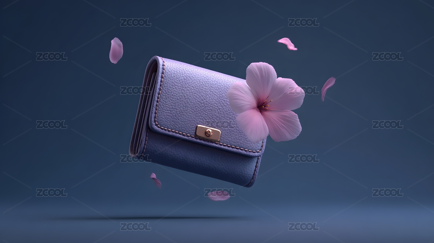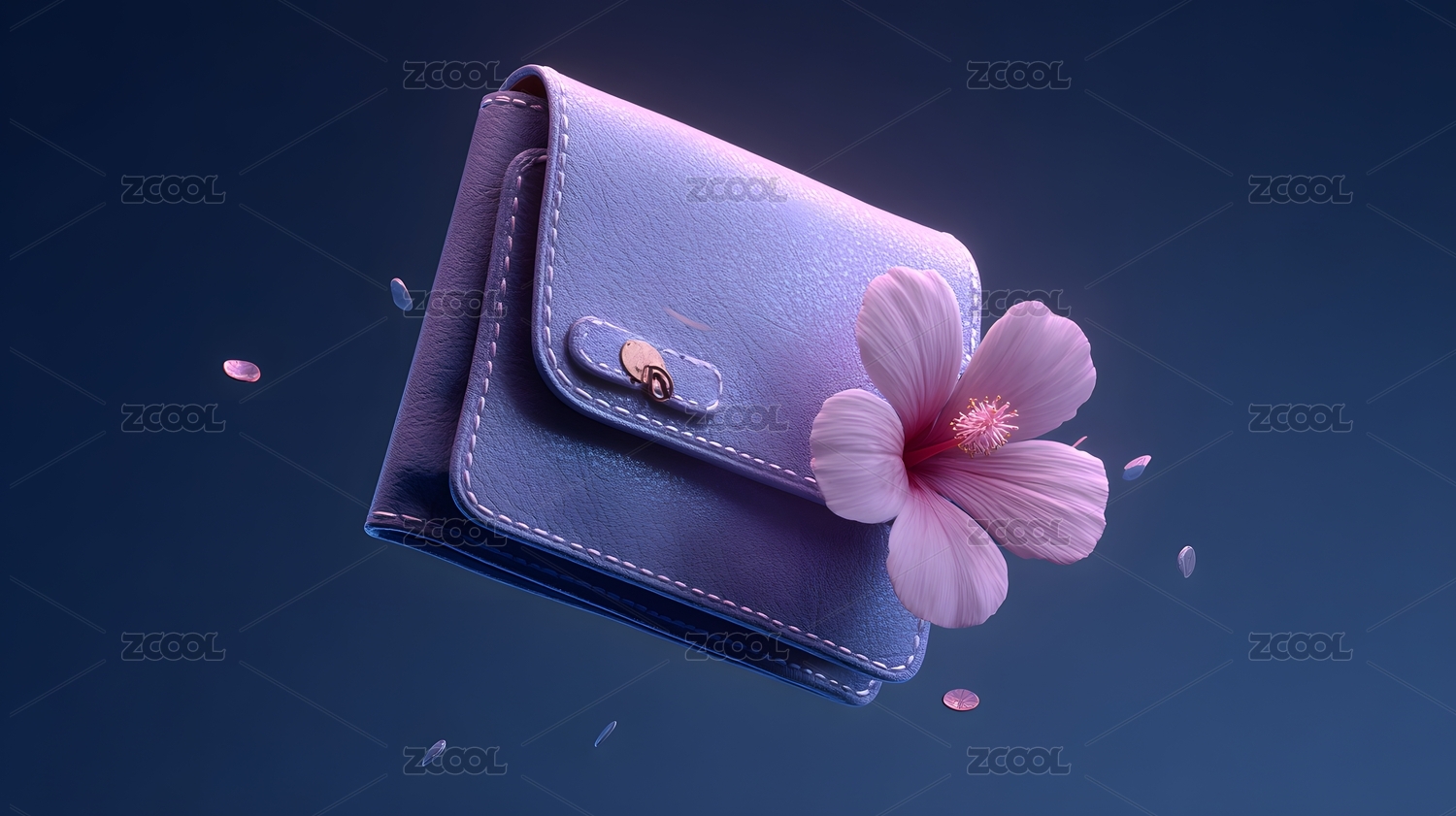 轻柔紫钱包悬浮花瓣暗蓝背景