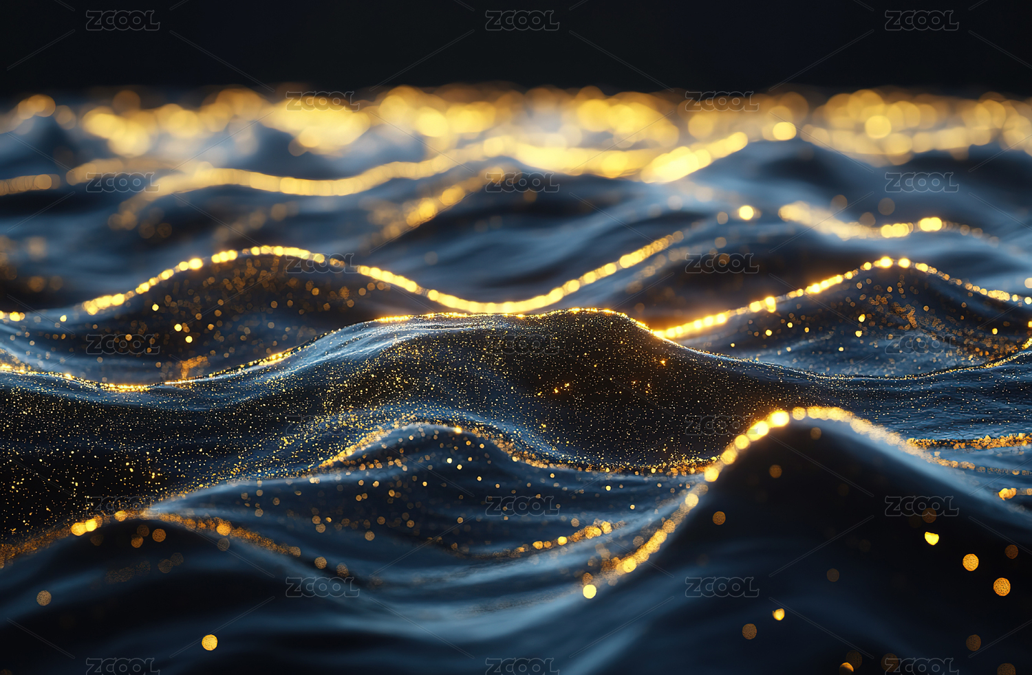 深蓝色波浪抽象海报背景,散发着橙色光点