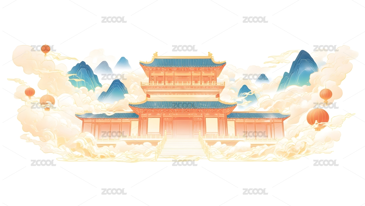 蓝色,山峦,建筑,天空,梦幻,风景,装饰,传统,云海,山峰