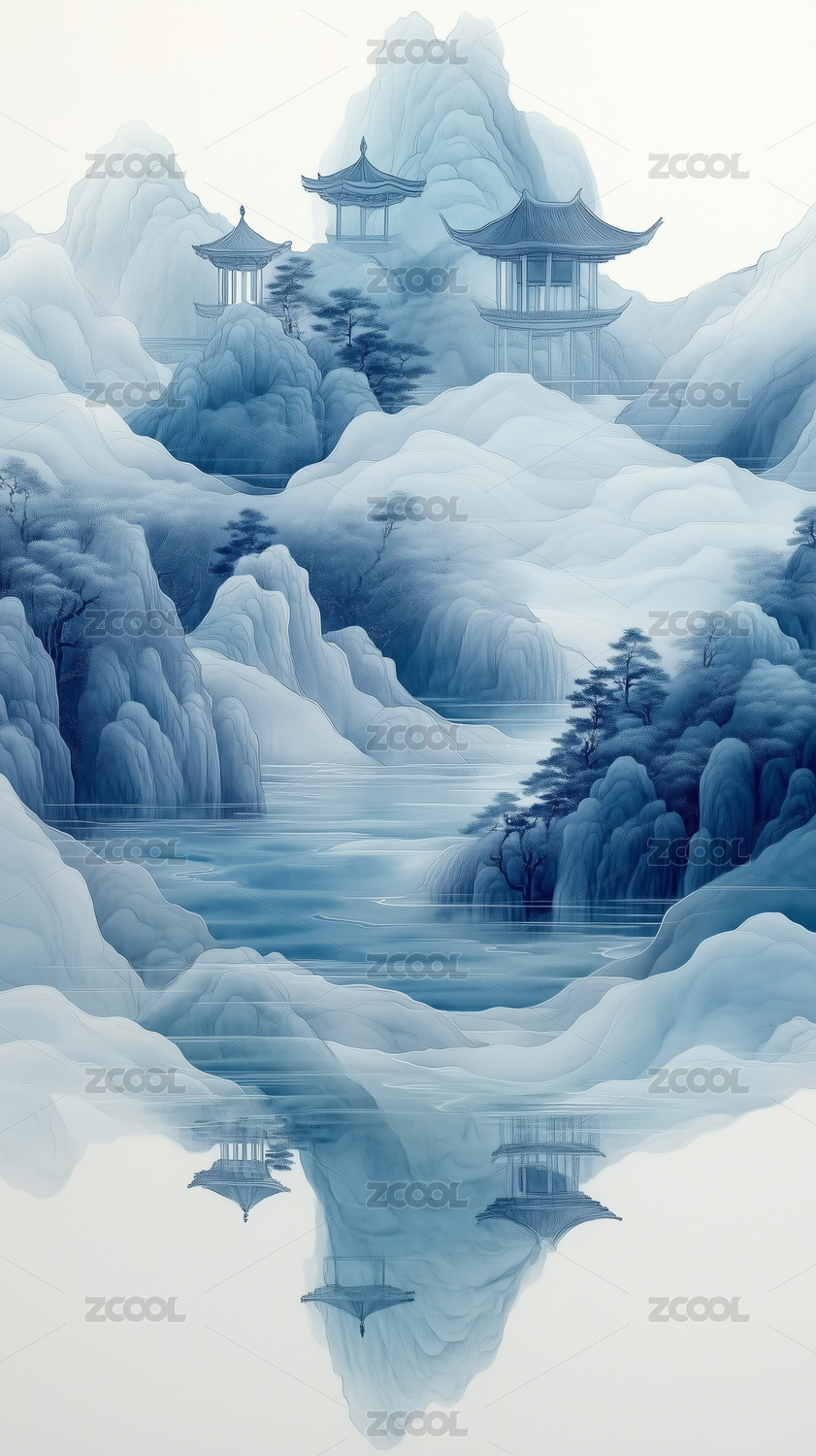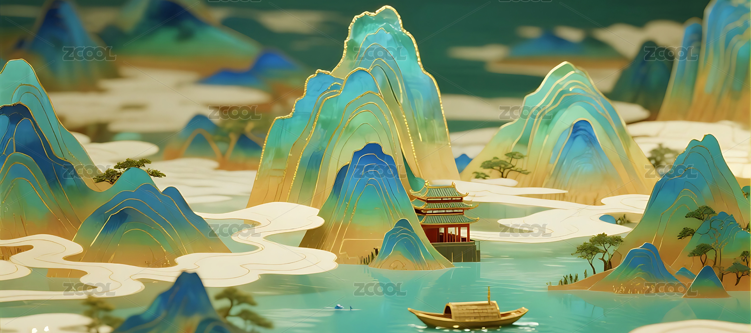 纸雕,立体,玻璃,背景,山水,小舟,国风