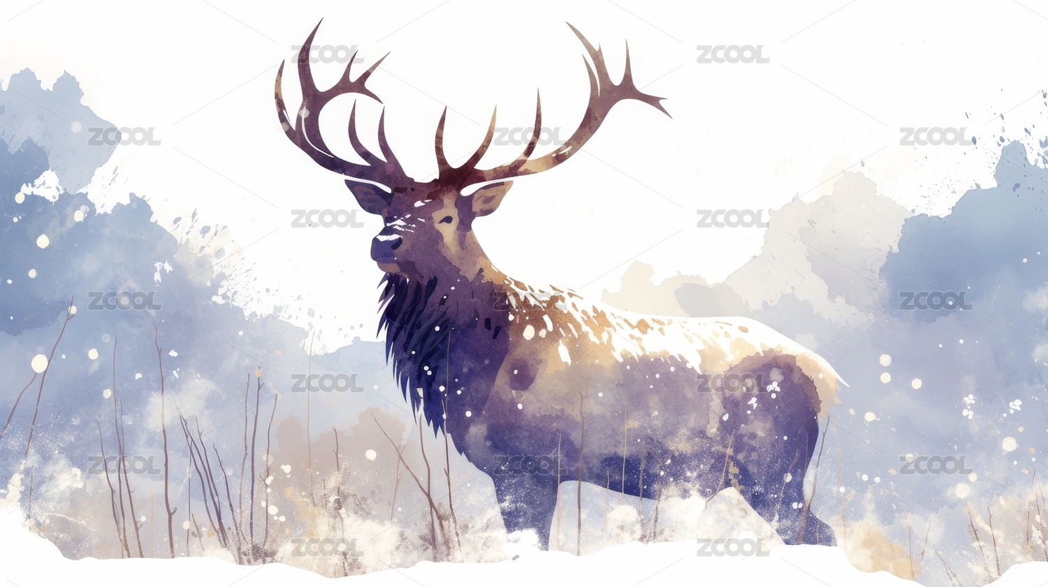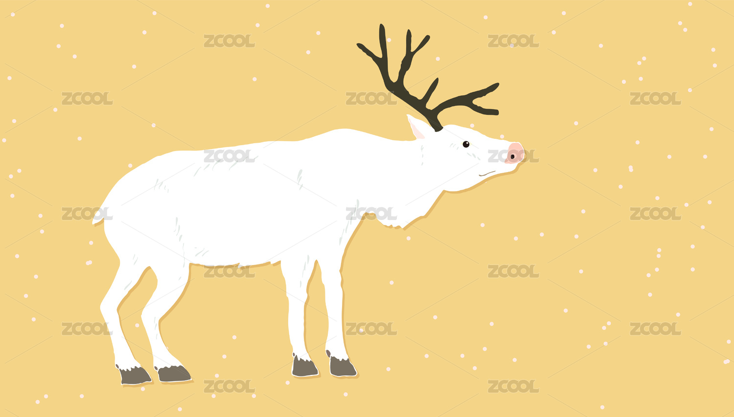 雪地上一只鹿雪花树枝蓝色夜空三维插画