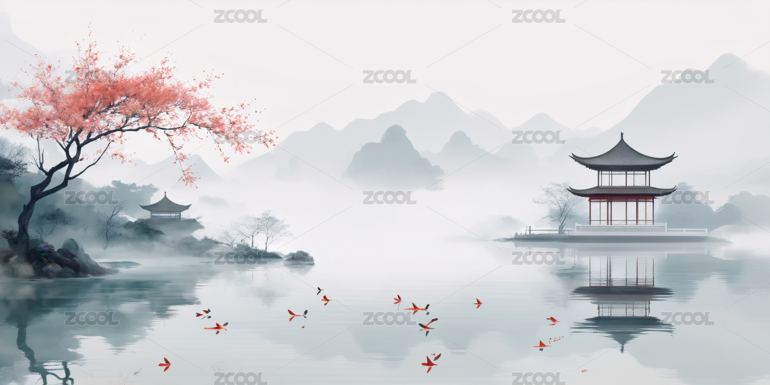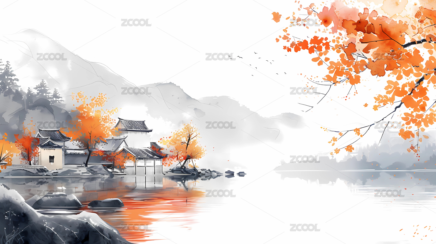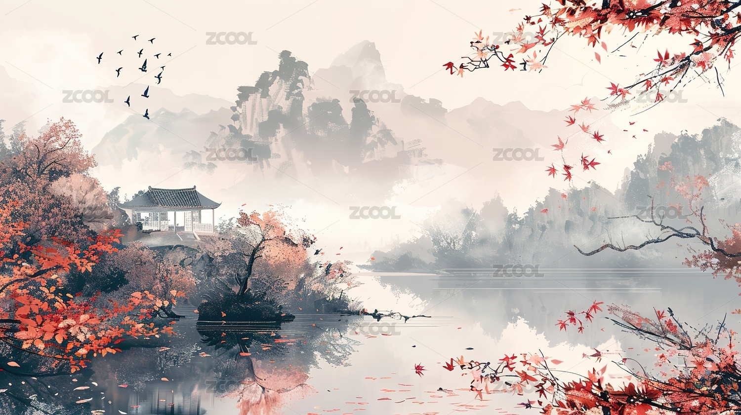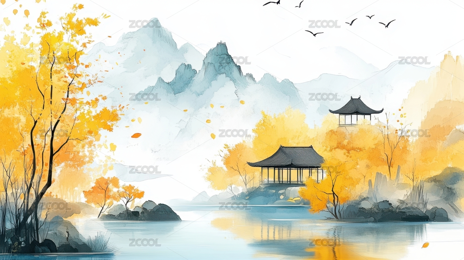 中国风秋天插画建筑凉亭暖色风景壁纸