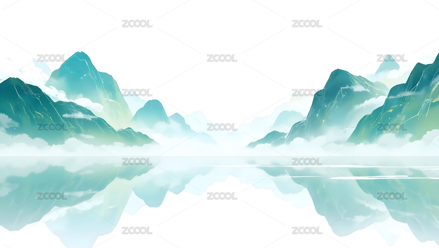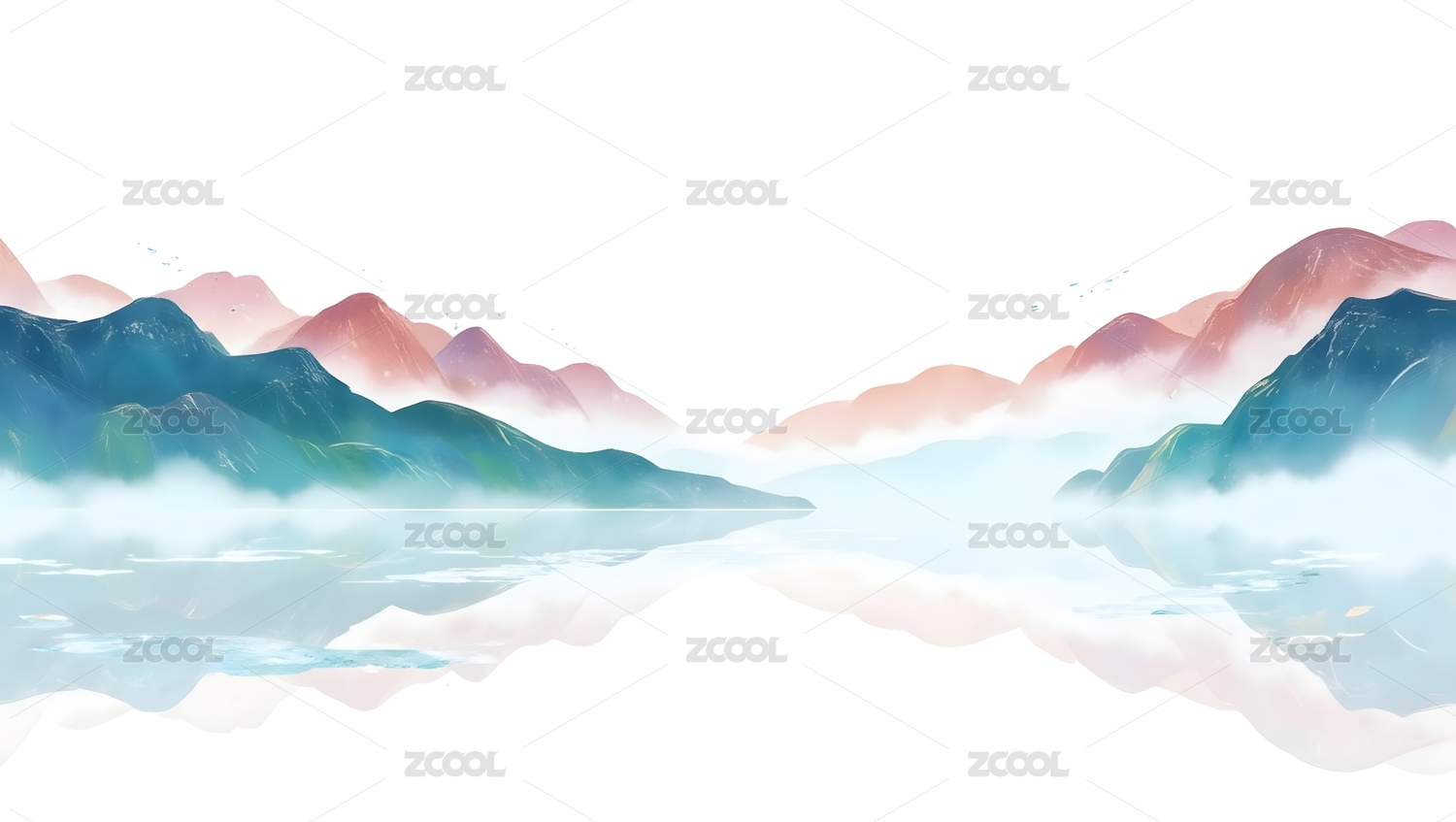 国潮,山水,中国风,新中式,湖泊,倒影,水面,山峦,水墨画,云雾
