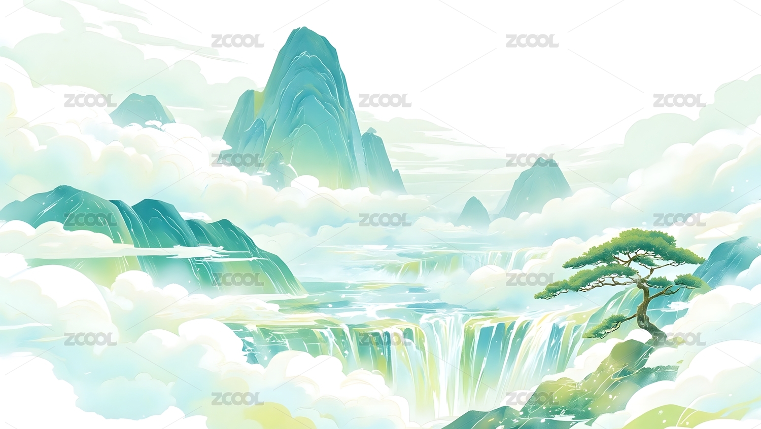 国潮,山水,中国风,新中式,湖泊,倒影,山峦,风景,云雾,山峰