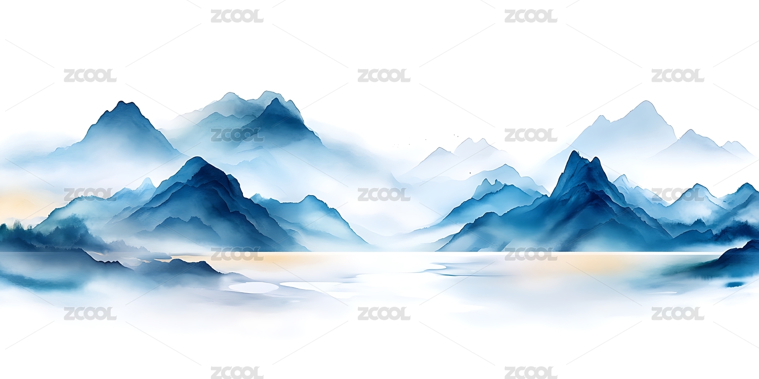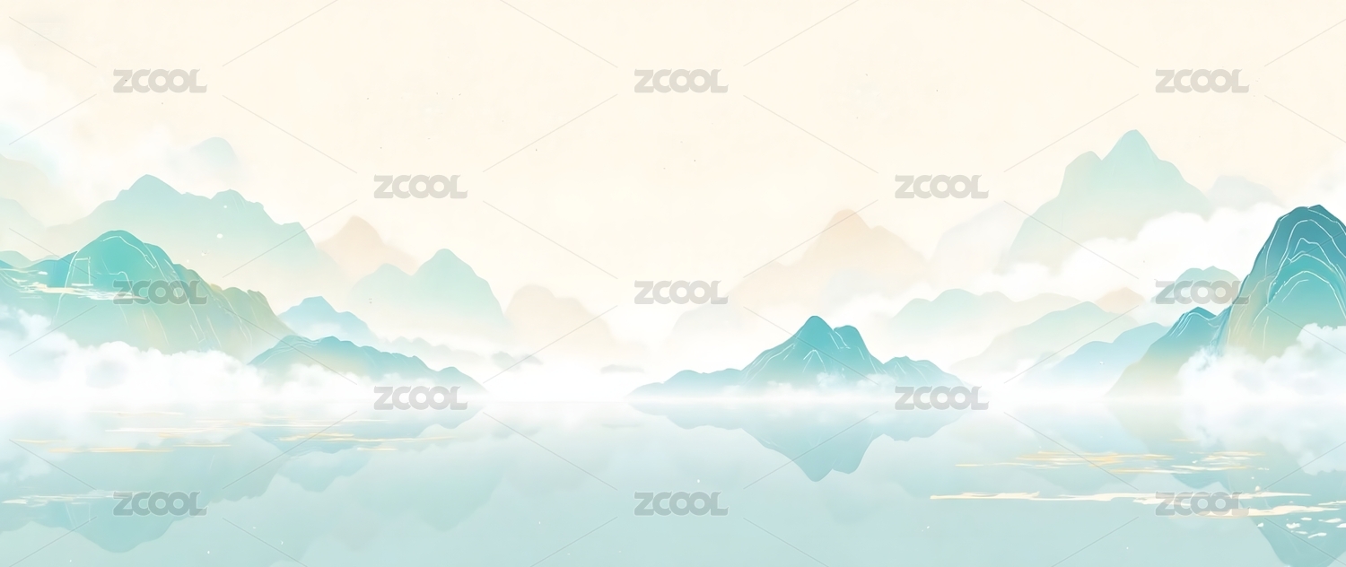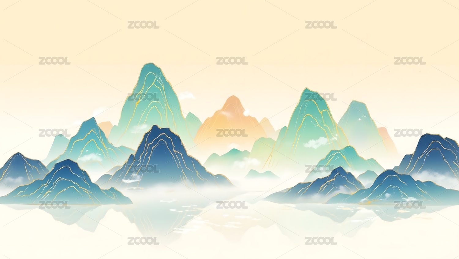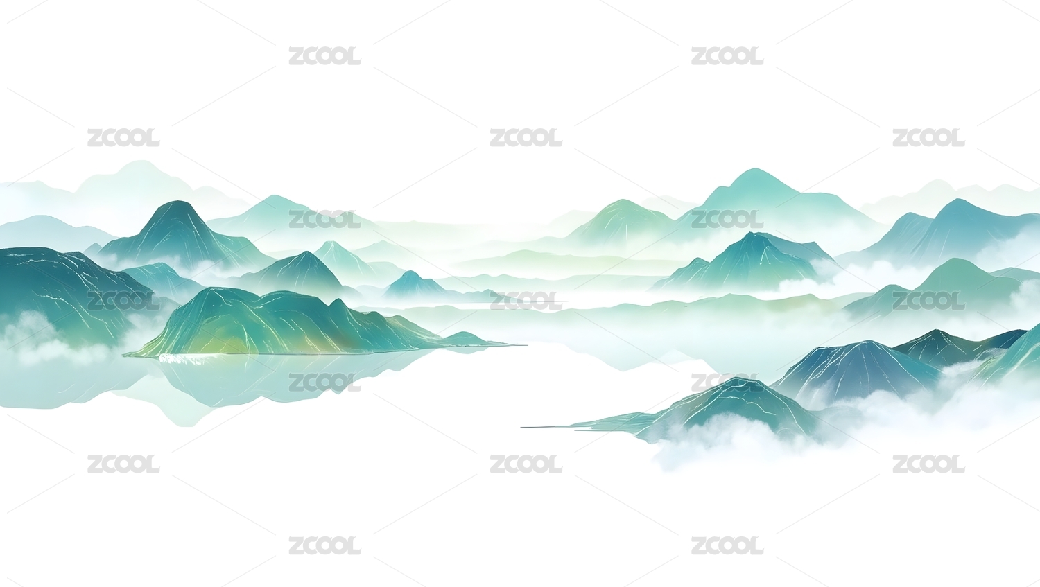 新中式,国潮,山水,山峰,青色,风景,远山,云雾,山峦,柔和