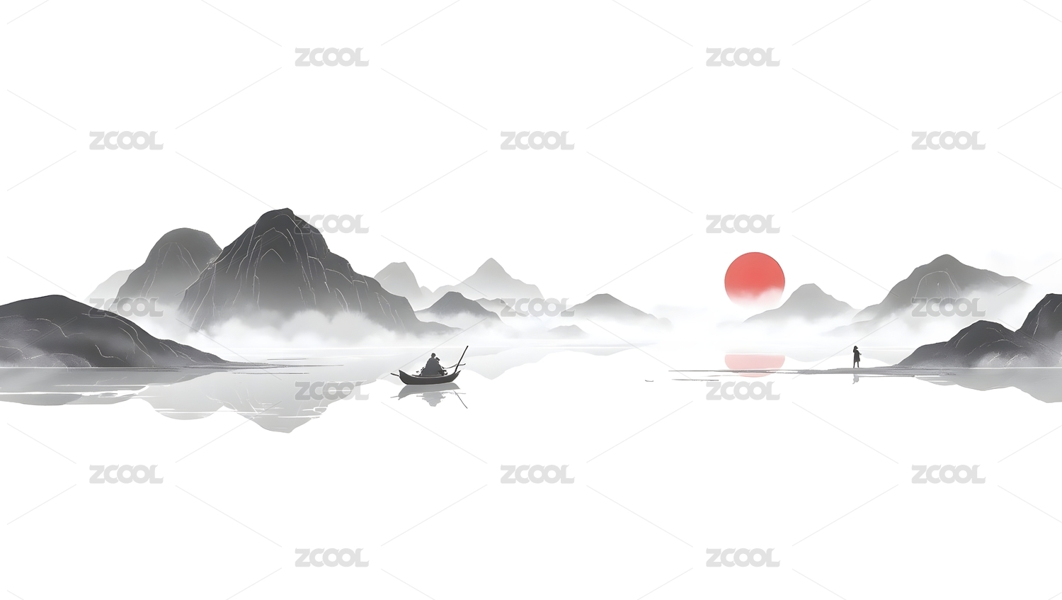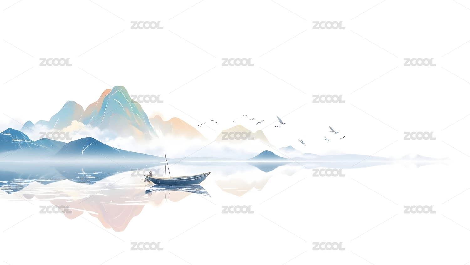 国潮,山水,中国风,新中式,湖泊,倒影,远山,风景,水墨,画风