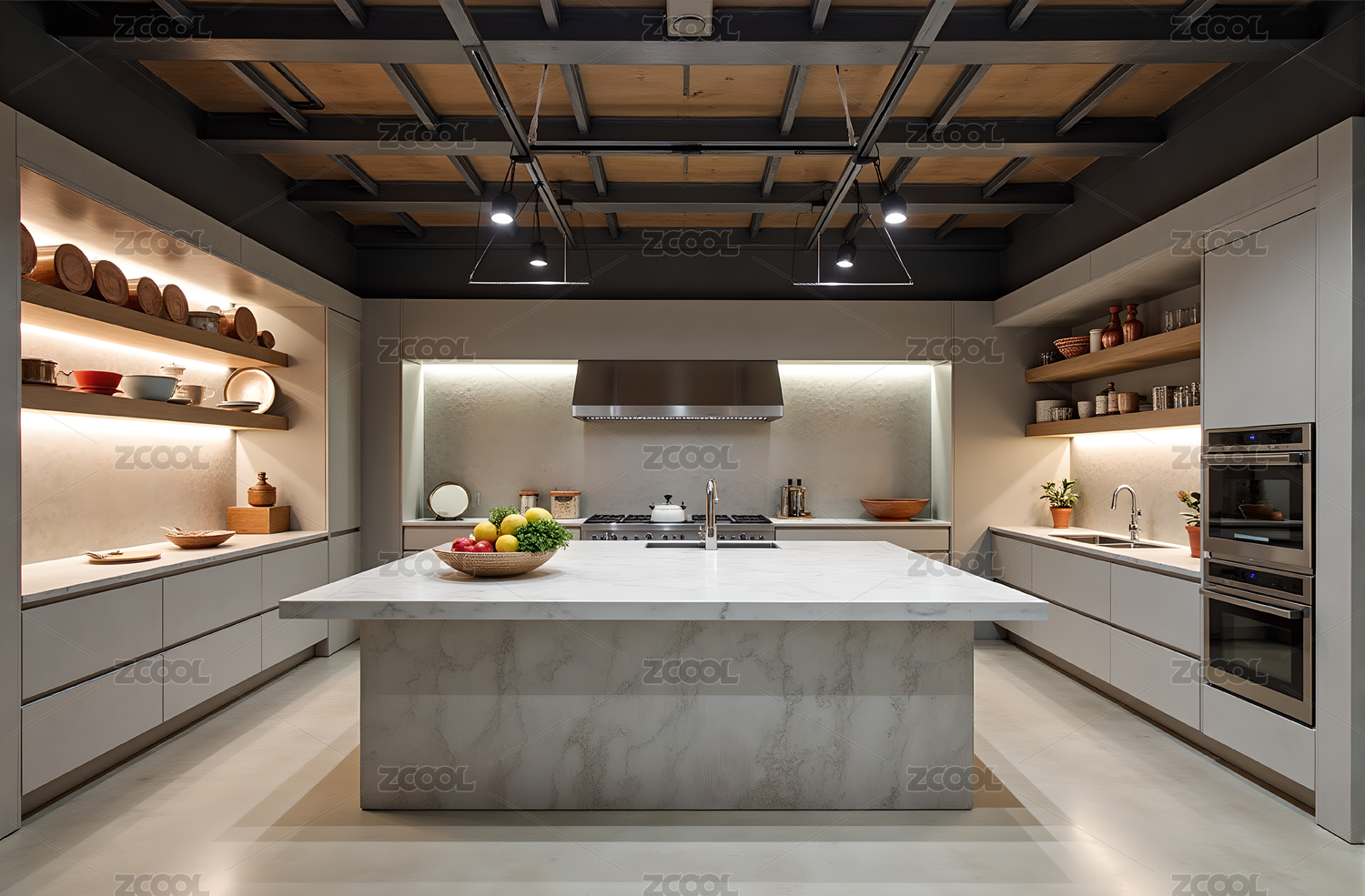 开放式现代厨房设计与木质横梁