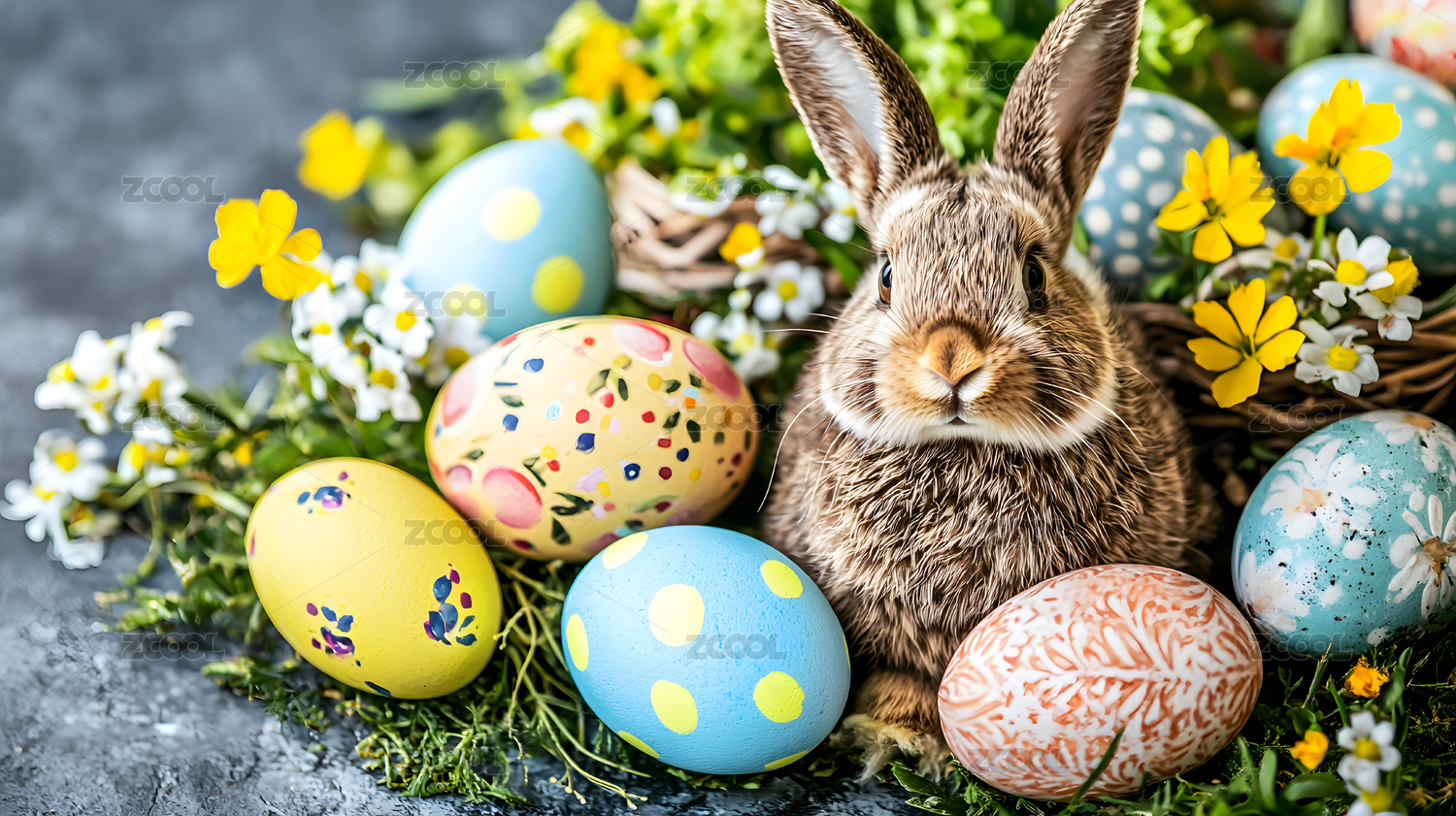 可爱棕色兔子周围环绕着彩色复活节彩蛋