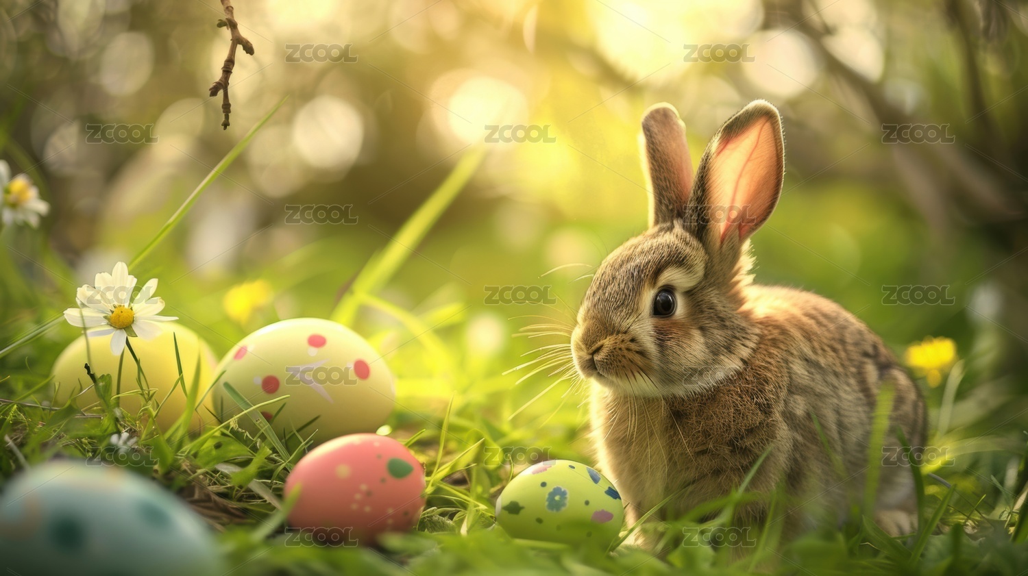 草地上可爱兔子与彩蛋