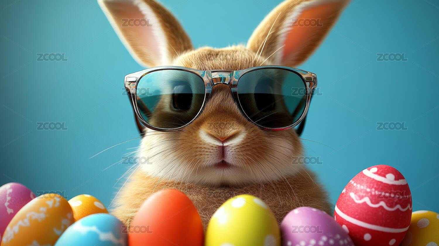 戴墨镜的复活节小兔子与彩蛋