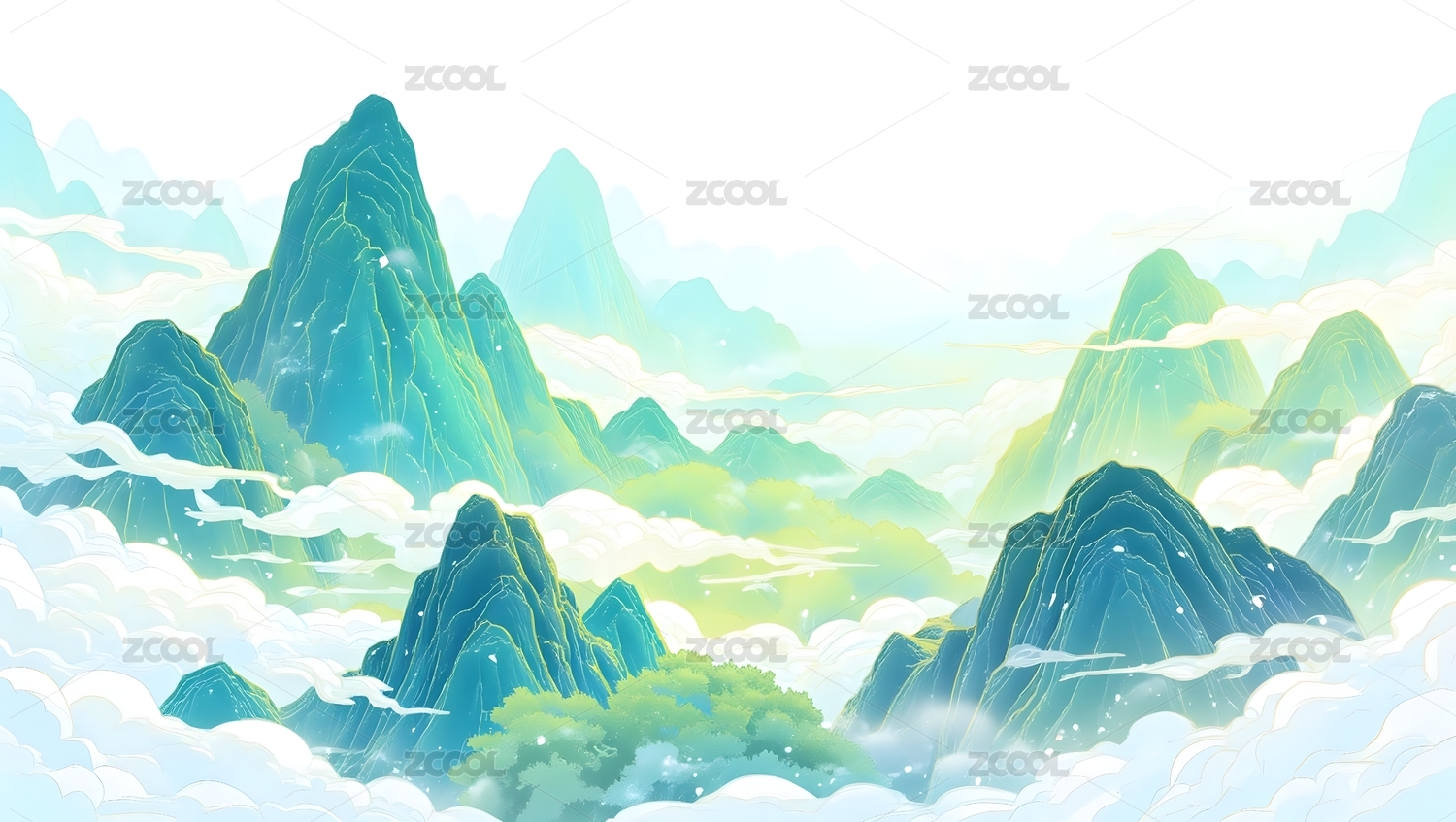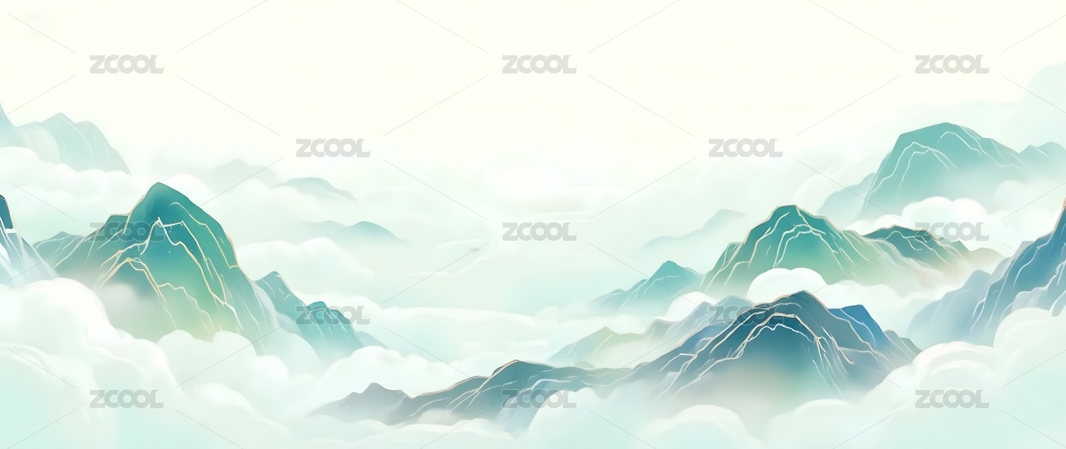 云雾,新中式,国潮,中国风,山水,山峦,山峰,青色,云海,云层