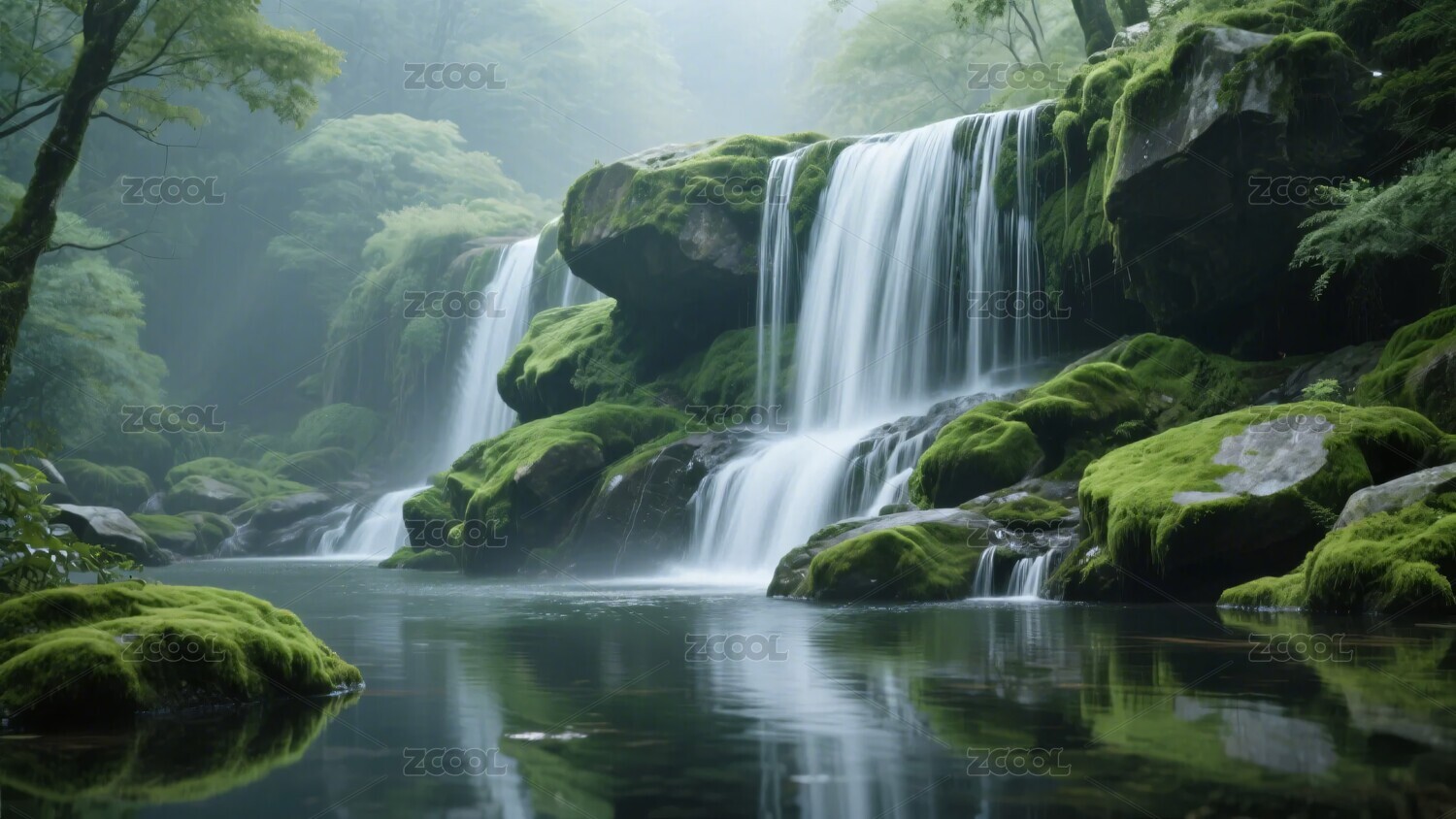 溪流,瀑布,山峦,绿植,自然景观,美景,插画,自然,清新,绿色