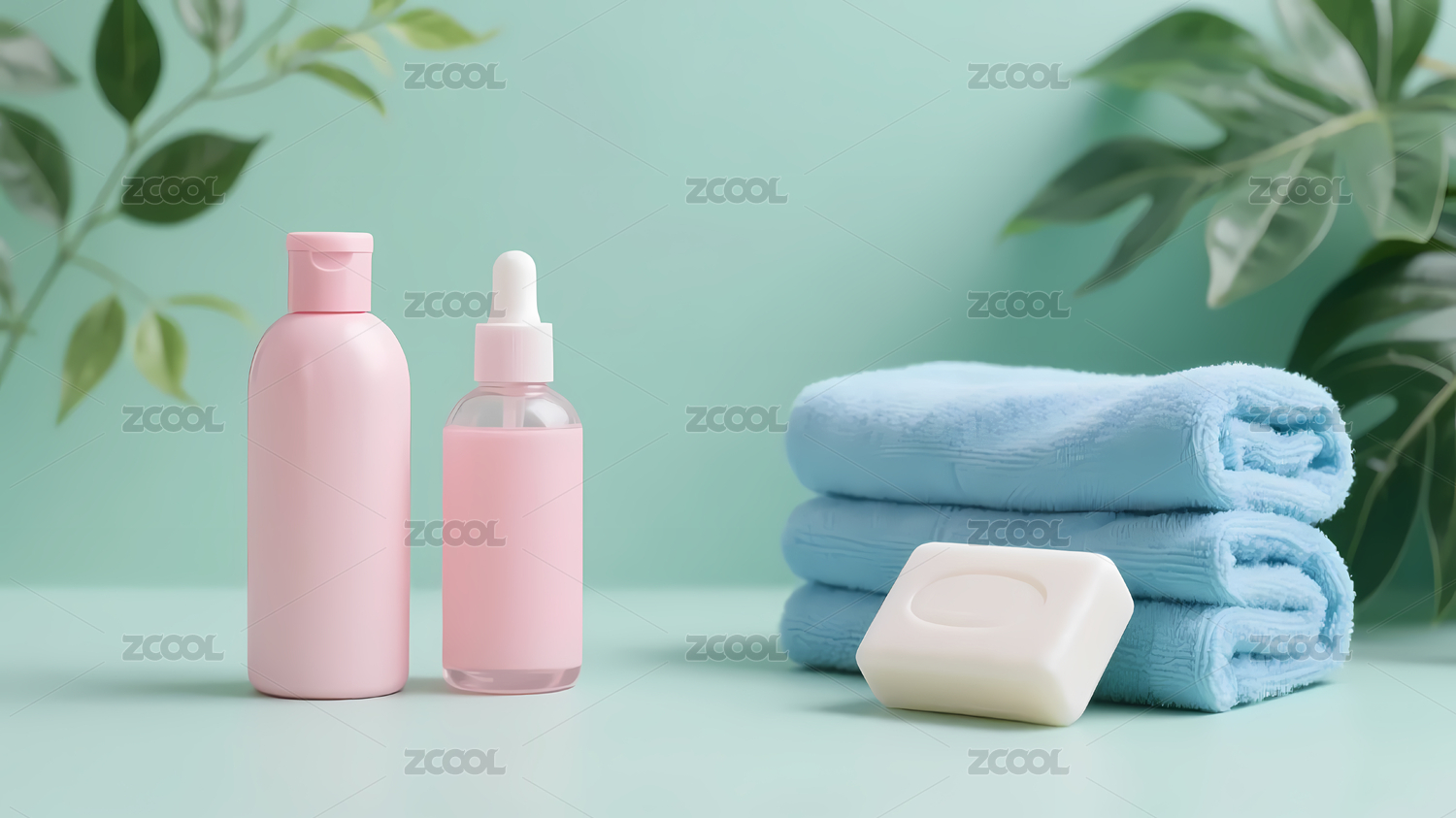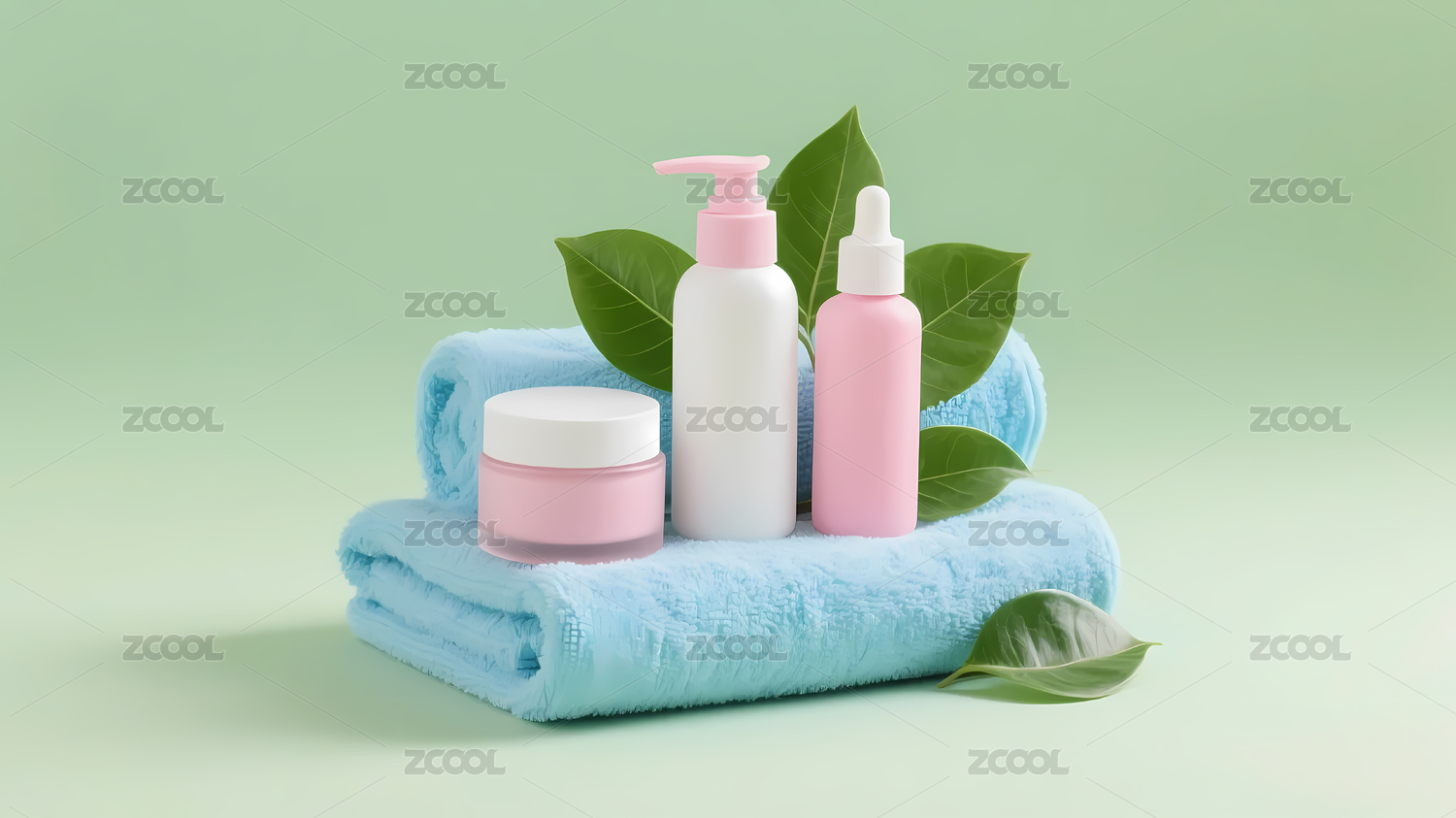 粉绿护肤品蓝毛巾绿叶