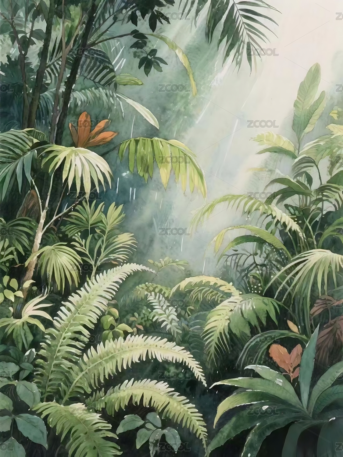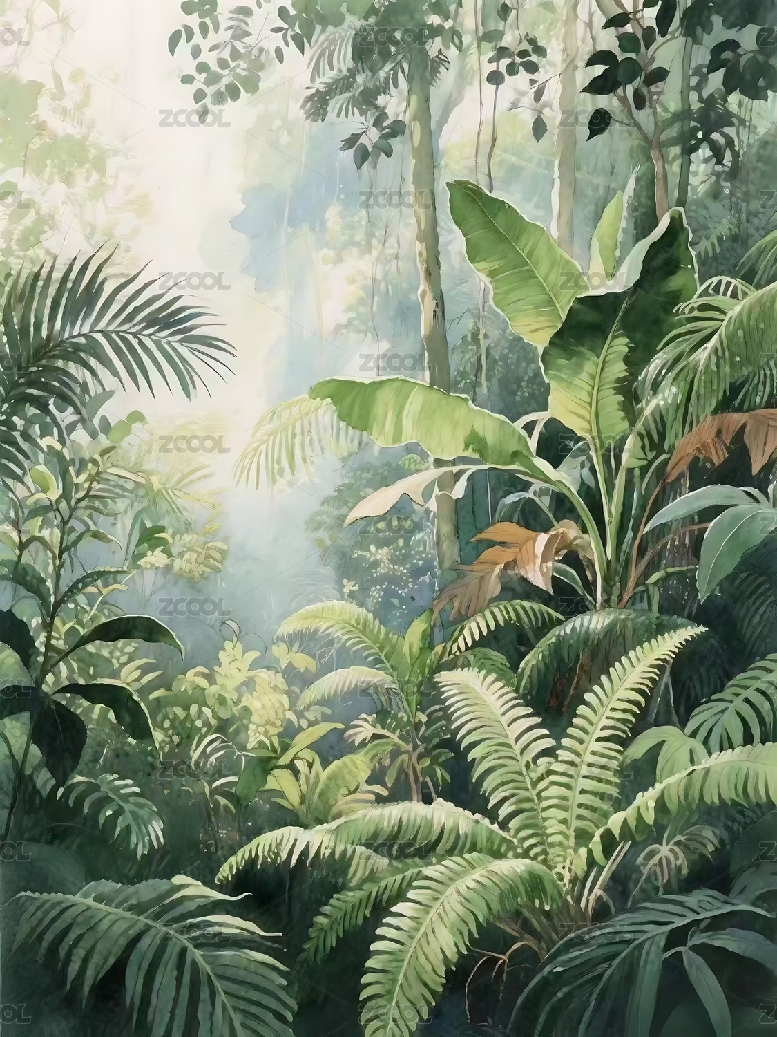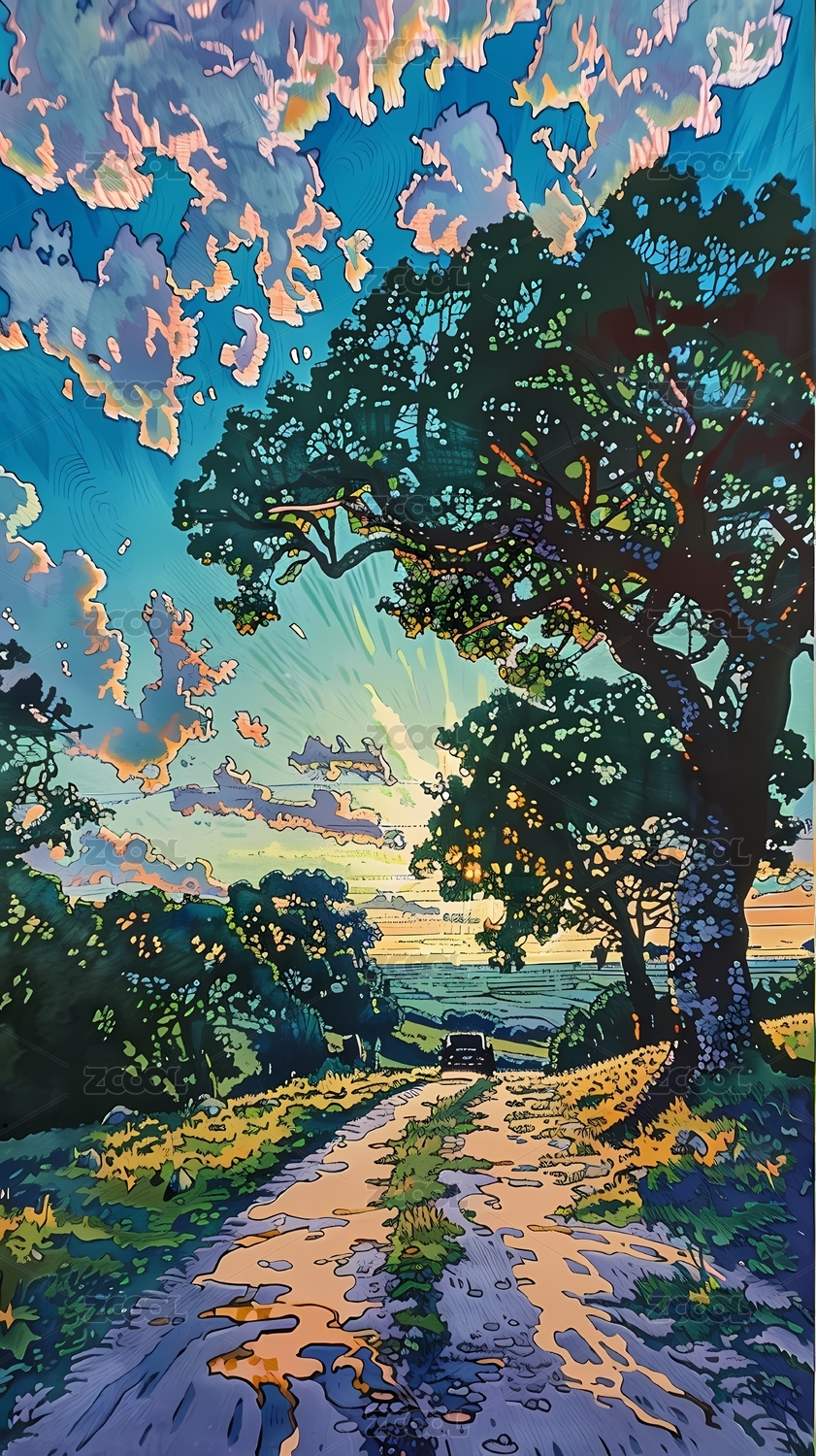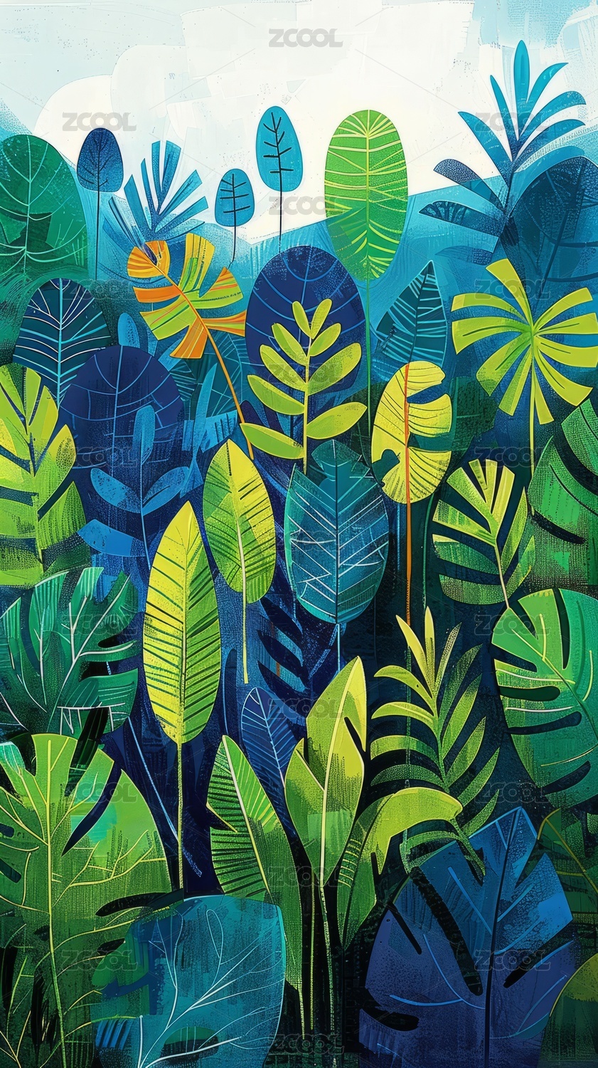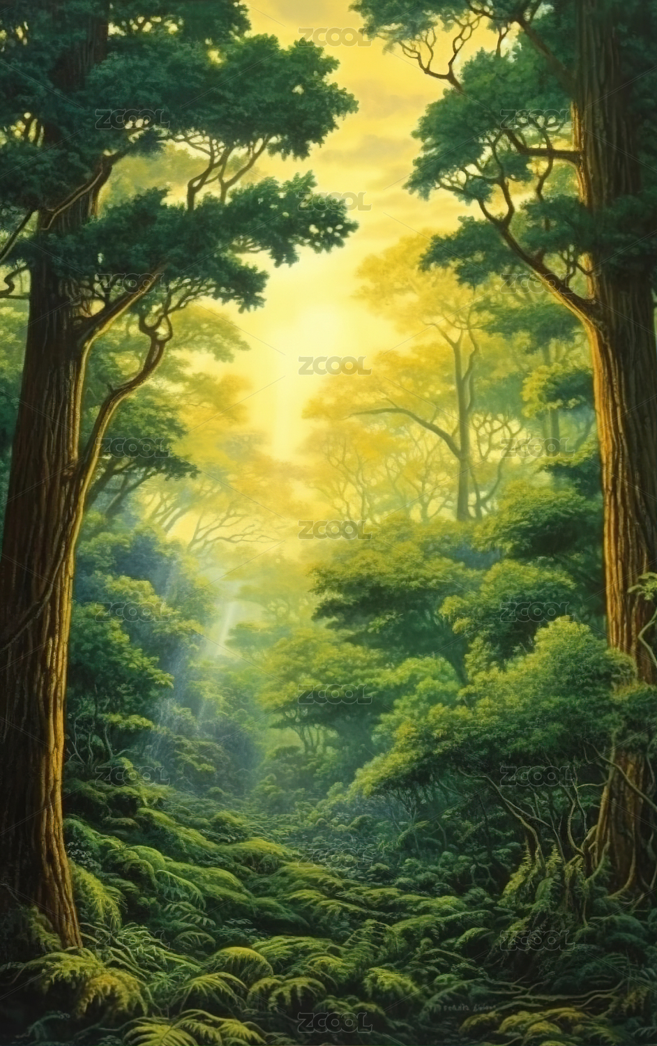 丛林,森林,树木,夕阳,植被,插画,自然,风景,艺术,日落