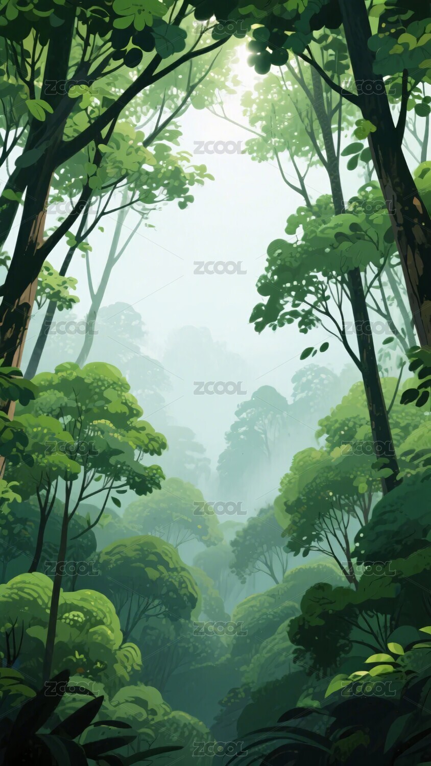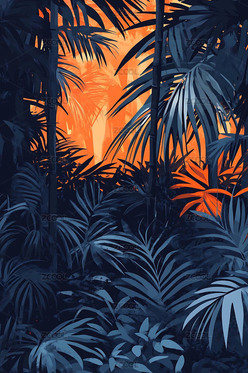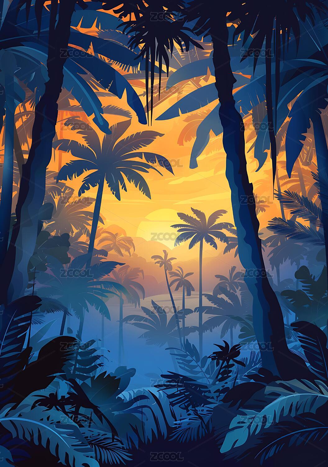 森林,树木,丛林,自然,插画,背景,植被,夕阳,黄昏,暖色调