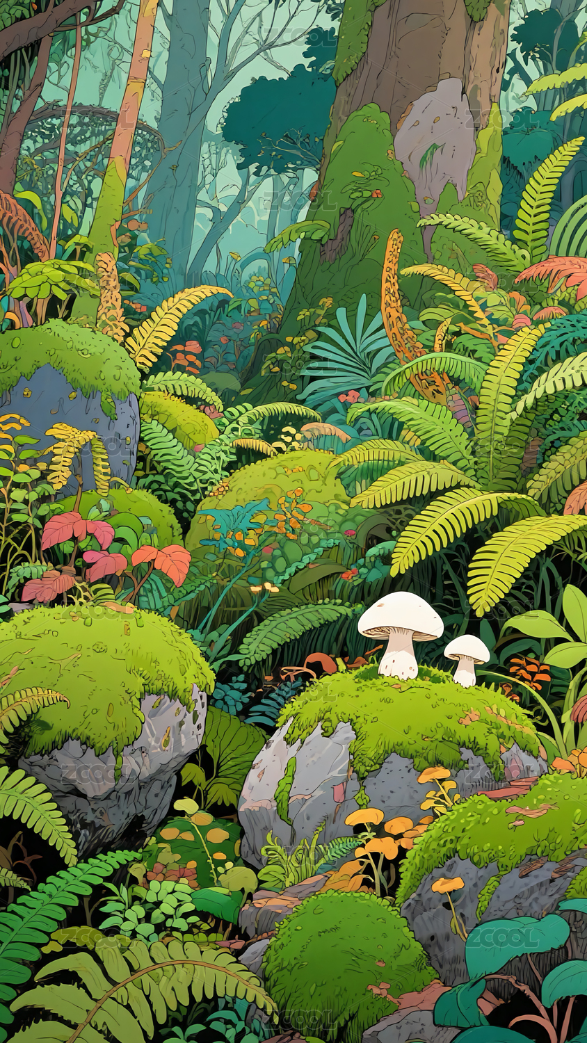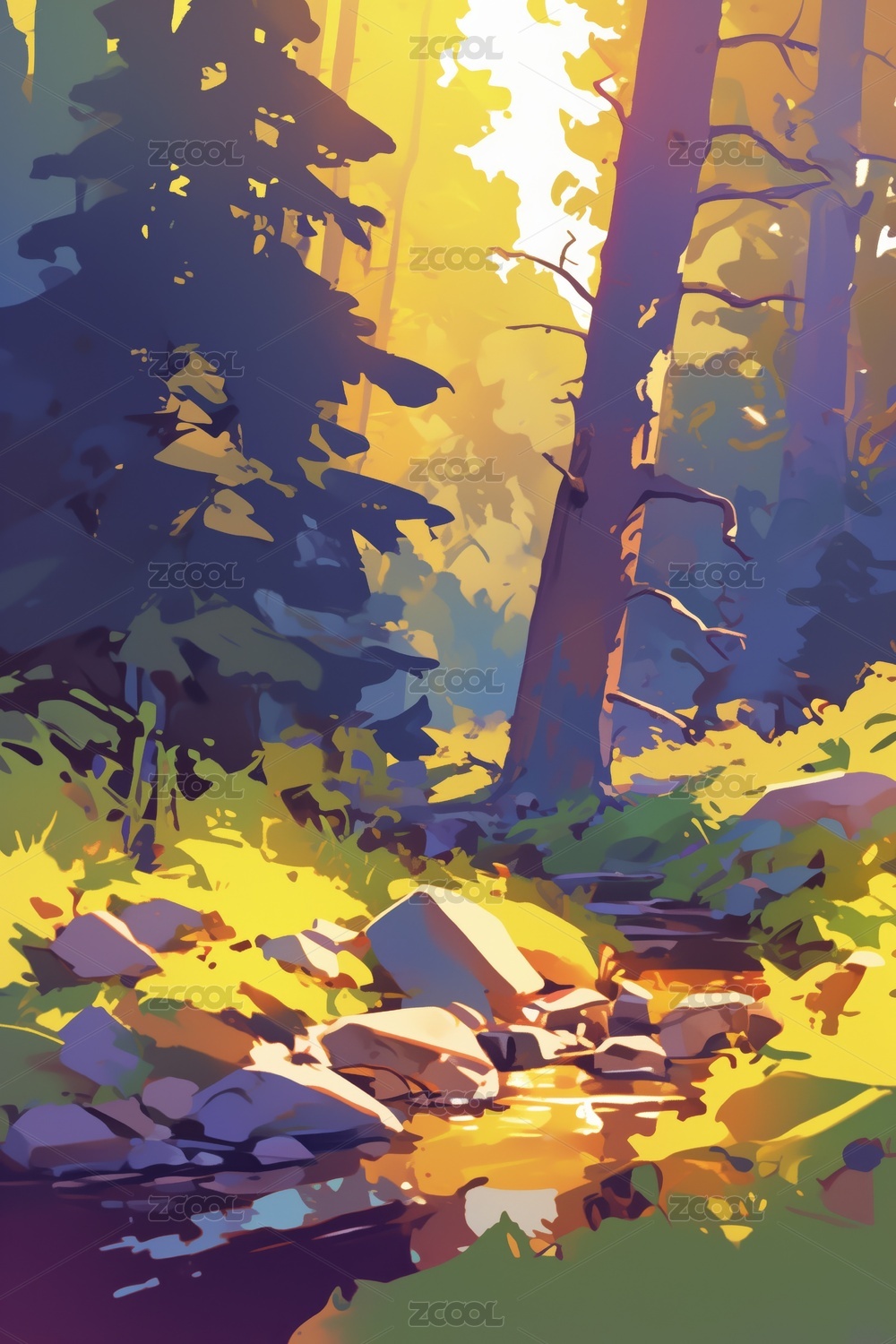 幽静绿色茂密森林中的清澈小溪插画绘画